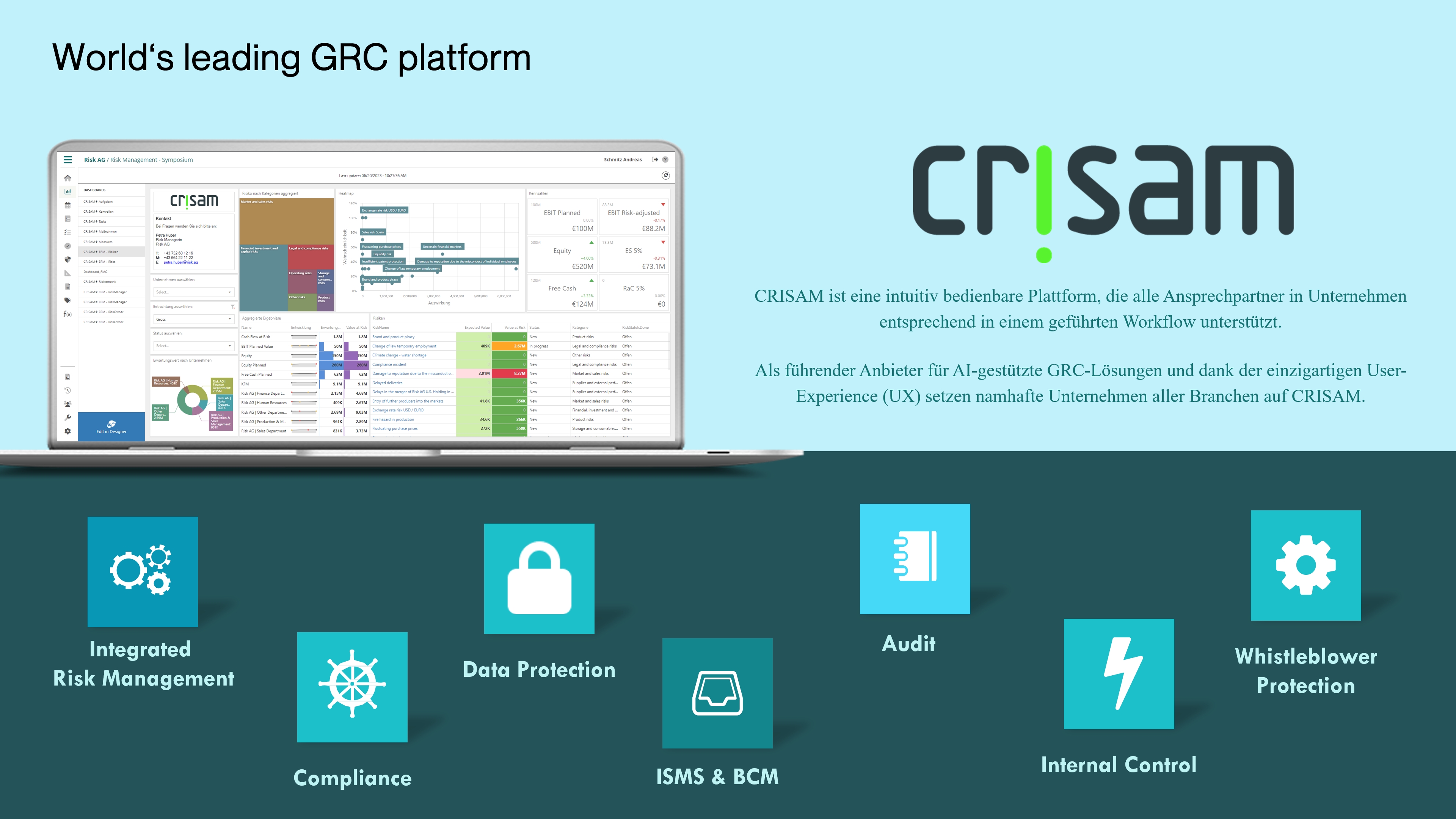 Die Firma entwickelt das Risikomanagement Informationssystem CRISAM® . Diese Lösung kombiniert eine Vielzahl an GRC Anwendungsbereichen, wie IT-Sicherheits-Management, Enterprise Risk Management, Informationssicherheit, Internes Kontrollsystem, Datenschutz und Compliance Management nach über 50 Standards.