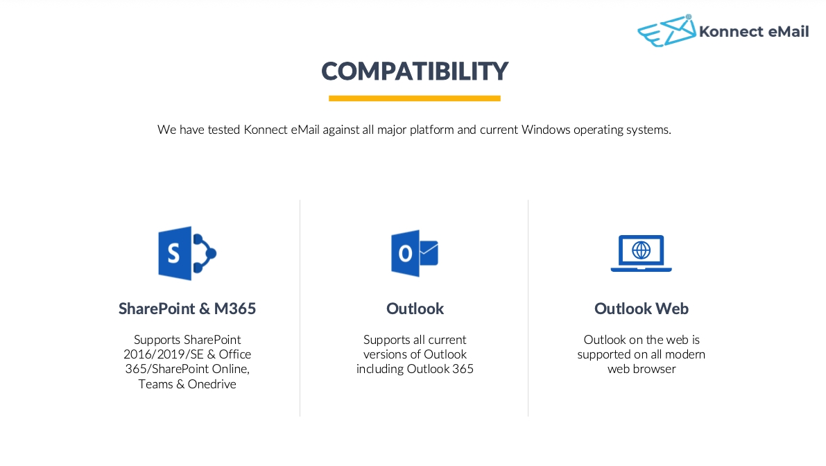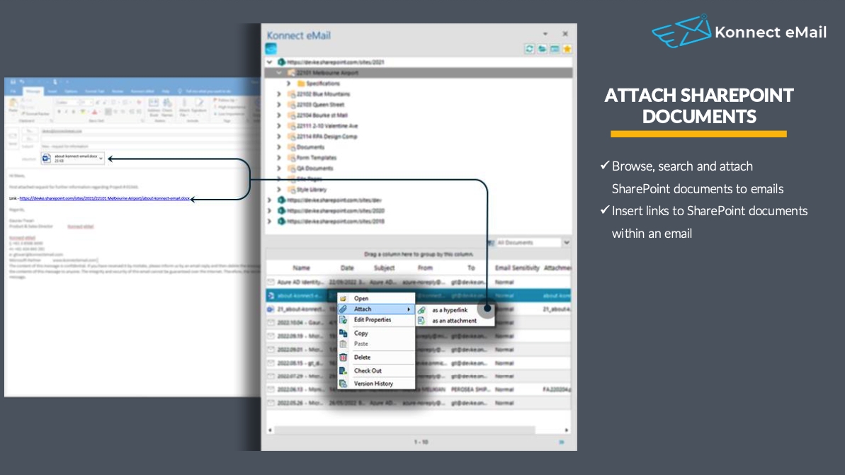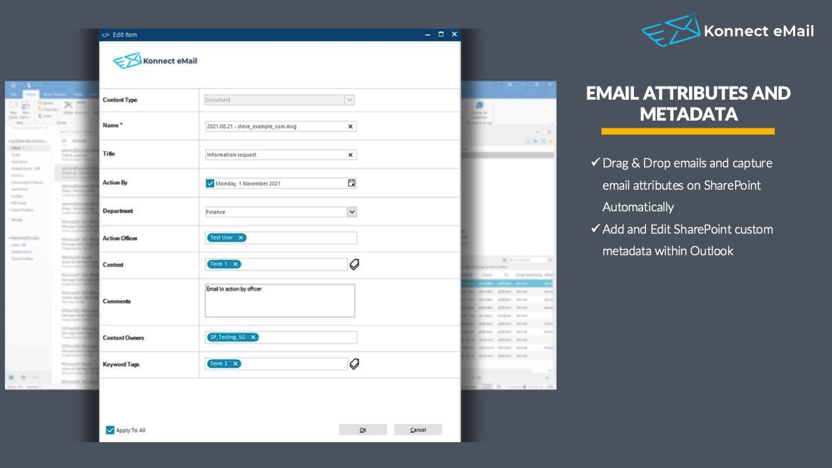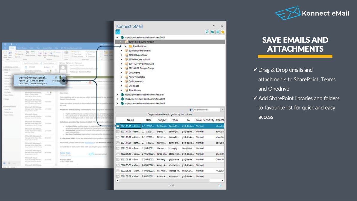 Outlook-Add-in „Konnect eMail Central“: Drag-and-Drop von E-Mails/Anhängen nach SharePoint, Teams und OneDrive; Metadaten-Erfassung; Browse/Edit/Search von SharePoint-Inhalten in Outlook; Anhängen von SharePoint-Dokumenten an E-Mails. Ziel ist die Förderung der SharePoint-Adoption und die Einhaltung von Aufbewahrungs- und Compliance-Vorgaben.