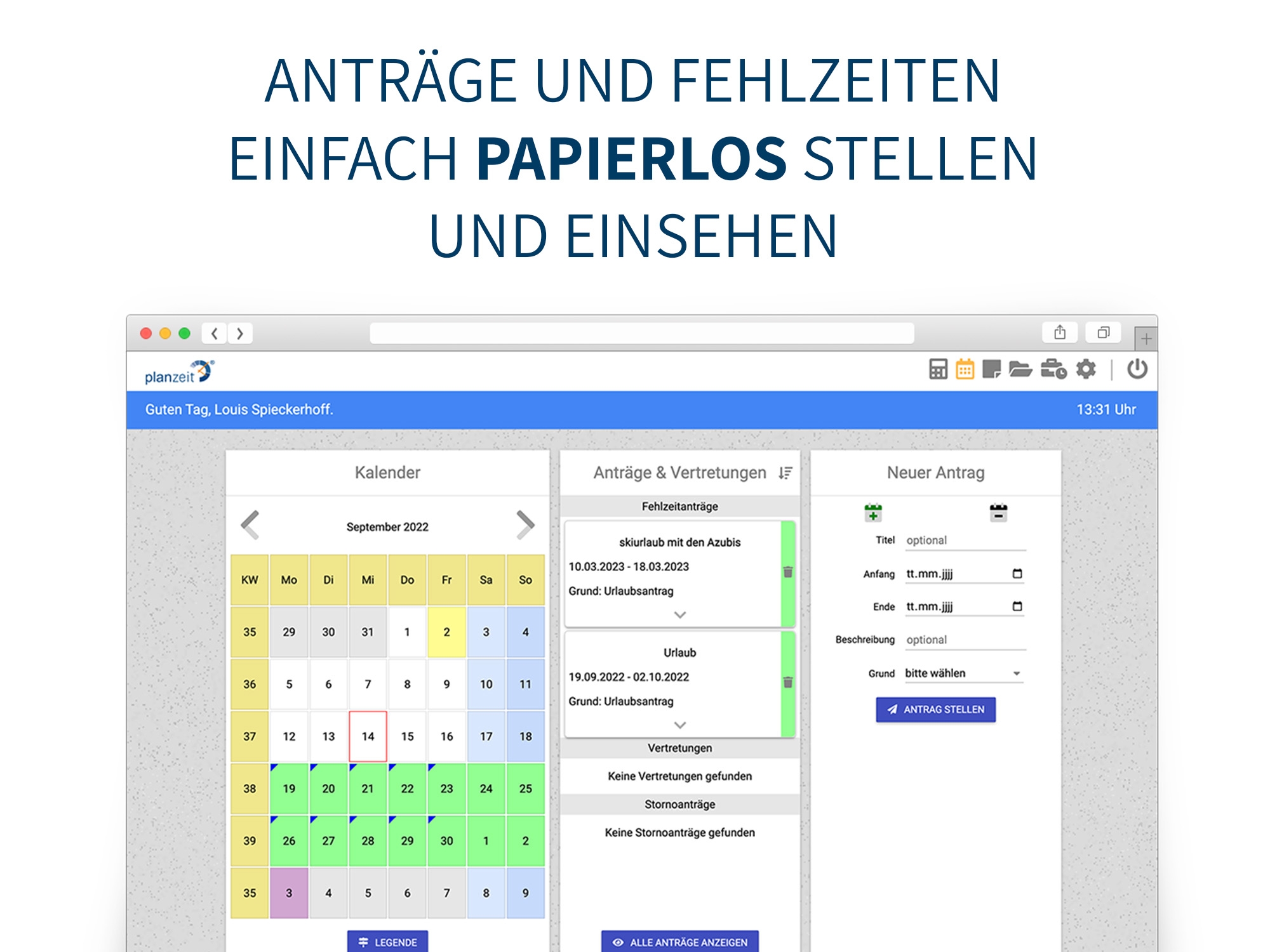 Mit dem Mitarbeiterportal von planzeit® sorgen Sie für eine hohe Zufriedenheit bei Ihren Mitarbeitern. Durch den Einsatz des Mitarbeiter Service Portals, binden Sie Ihre Mitarbeiter intensiv in die Unternehmensprozesse mit ein. Zudem sorgen Sie für einen hohen Informationsstand und erleichtern die Abläufe für beispielsweise Urlaubsplanung und Buchungsnacherfassung.