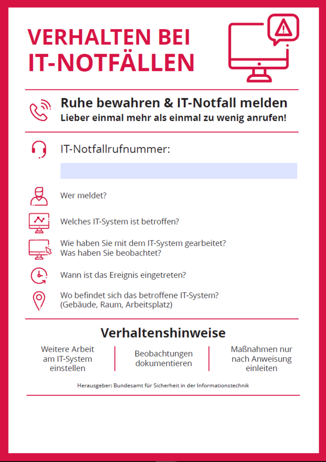 Mitarbeiter sollten wissen, wie sie verdächtige Aktivitäten erkennen und diese melden können. Generell ist es wichtig zu vermitteln, dass Mitarbeiter lieber einmal mehr bei der IT nachfragen, ob beispielsweise eine E-Mail geöffnet werden darf oder ob ein Anhang oder Link „ok“ ist oder nicht. Ein klarer Prozess für das Melden von Vorfällen sollte etabliert und den Mitarbeitern vermittelt werden. Hilfreich kann hier beispielsweise die IT-Notfallkarte „Verhalten bei IT-Notfällen“ des BSI sein. Die Notfallkarte (als PDF downloadbar) kann an zentralen zugänglichen Orten (Flur), in den Arbeitsräumen (Büro, Werkraum) oder an einzelnen IT-Arbeitsplätzen platziert werden und gibt analog zu den Hinweisschildern über das Verhalten im Brandfall wichtige Verhaltenshinweise.