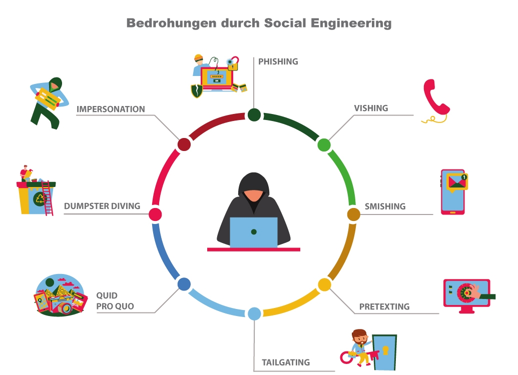 Es gibt verschiedene Methoden des Social Engineering, die von Angreifern verwendet werden, um ihr Ziel zu erreichen.
