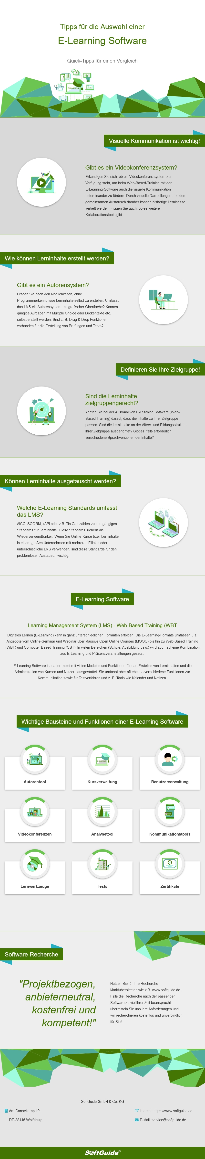 In dieser Infografik zum Thema "Auswahl einer E-Learning Software" haben wir Ihnen ausgesuchte Tipps für die Software-Auswahl sowie wichtige Module und Funktionen von E-Learning Software zusammengestellt. Diese Tipps und Funktionen stellen nur einen Auszug aus den umfangreicheren Informationen unserer "Software-Tipps zur Auswahl betrieblicher Software" dar.