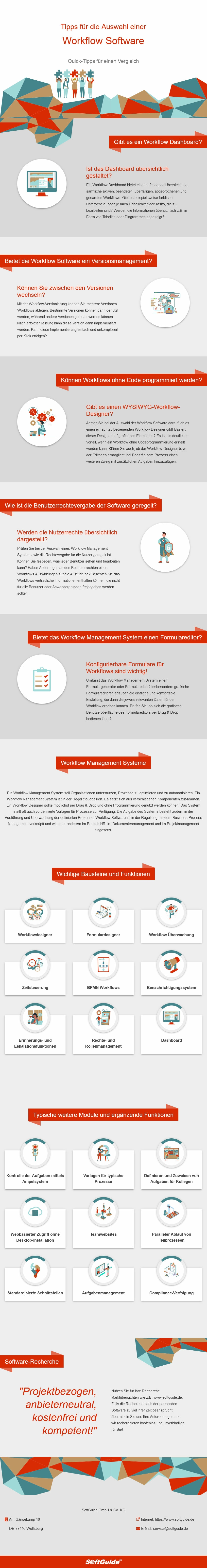 In dieser Infografik zum Thema "Auswahl einer Workflow Software" haben wir Ihnen ausgesuchte Tipps für die Software-Auswahl sowie wichtige Module und Funktionen von Workflow Software zusammengestellt. Diese Tipps und Funktionen stellen nur einen Auszug aus den umfangreicheren Informationen unserer "Software-Tipps zur Auswahl betrieblicher Software" dar.