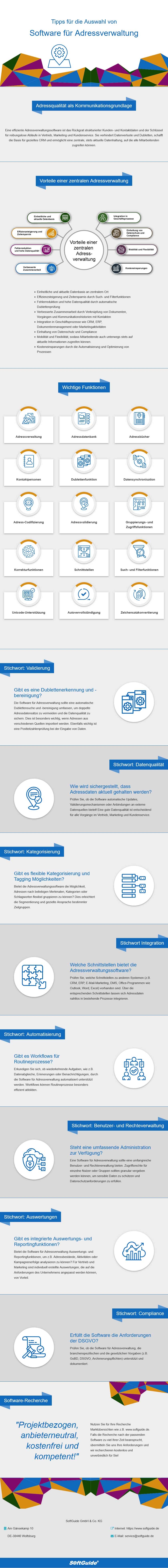 In dieser Infografik zum Thema "Software für Adressverwaltung" haben wir Ihnen ausgesuchte Tipps für die Adressverwaltungssoftware sowie wichtige Module und Funktionen für die Adressverwaltungssoftware zusammengestellt. Diese Tipps und Funktionen stellen nur einen Auszug aus den umfangreicheren Informationen unserer Software-Tipps für die Auswahl von Adressverwaltungssoftware dar.