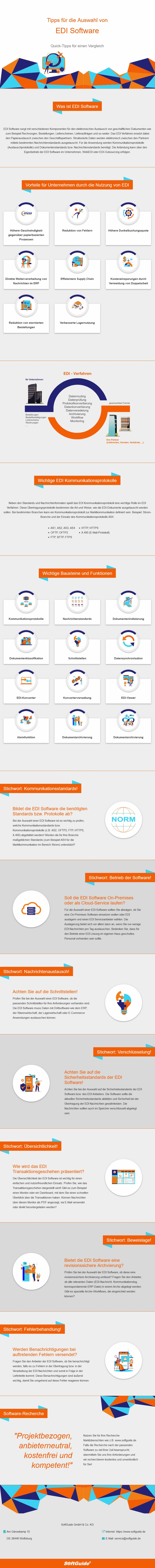 In dieser Infografik zum Thema "EDI Software" haben wir Ihnen ausgesuchte Tipps für die Software-Auswahl sowie wichtige Module und Funktionen von EDI Software zusammengestellt. Diese Tipps und Funktionen stellen nur einen Auszug aus den umfangreicheren Informationen unserer Software-Tipps für EDI Software dar.