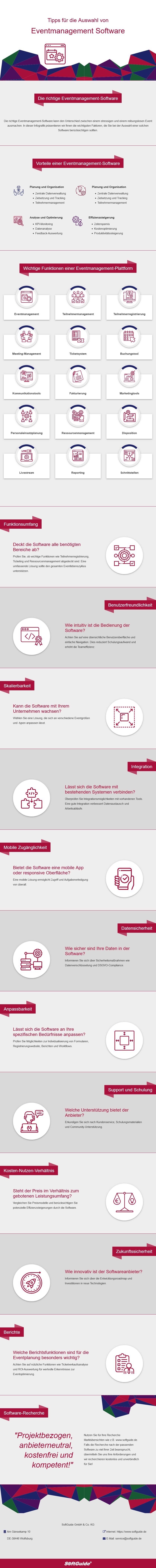 In dieser Infografik zum Thema "Eventmanagement Software" haben wir Ihnen ausgesuchte Tipps für die Software-Auswahl sowie wichtige Module und Funktionen von Eventmanagement Software zusammengestellt. Diese Tipps und Funktionen stellen nur einen Auszug aus den umfangreicheren Informationen unserer Software-Tipps für die Auswahl von Eventmanagement Software dar.