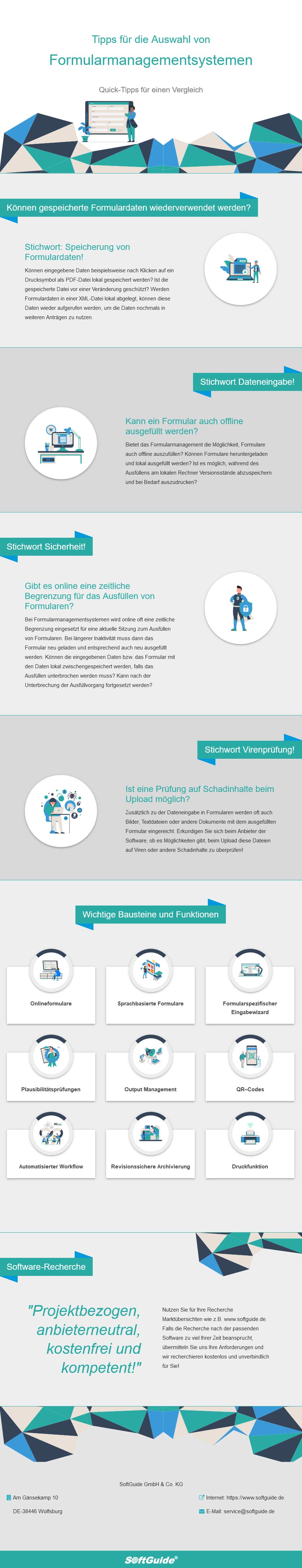 In dieser Infografik zum Thema "Formularmanagementsysteme" haben wir Ihnen ausgesuchte Tipps für die Software-Auswahl sowie wichtige Module und Funktionen von Formularmanagementsystemen zusammengestellt. Diese Tipps und Funktionen stellen nur einen Auszug aus den umfangreicheren Informationen unserer Software-Tipps für Formularmanagementsysteme dar.