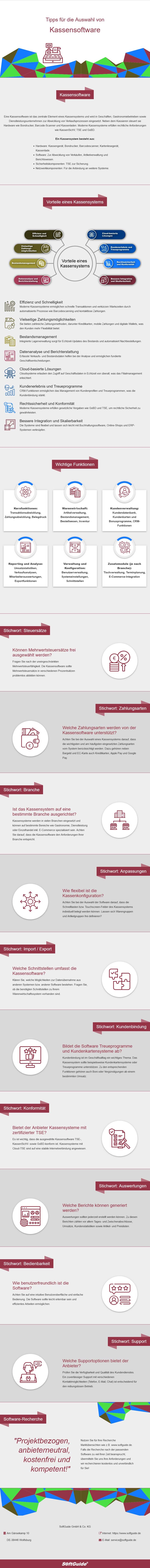 In dieser Infografik zum Thema "Kassensoftware" haben wir Ihnen ausgesuchte Tipps für die Software-Auswahl sowie wichtige Module und Funktionen für die Kassensoftware zusammengestellt. Diese Tipps und Funktionen stellen nur einen Auszug aus den umfangreicheren Informationen unserer Software-Tipps für die Auswahl von Kassensoftware dar.