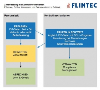 Durch die Echtzeitinformation wird die Zeiterfassung zum Kontrollmechanismus. Flintec hat zwei Kontrollmechanismen entwickelt. Der Kontrollmechanismus „Anwesenheitskontrolle“ prüft in Echtzeit die Einsatzzeiten an definierten Orten. Dabei werden Verspätungen und Fehlzeiten erkannt und gemeldet, wodurch die Reaktionszeiten für die Ersatzbeschaffung verkürzt werden. Der Kontrollmechanismus „Arbeitszeitregelung“ prüft in Echtzeit die Arbeitszeiten in Bezug auf Arbeitszeitregelungen und Betriebsvereinbarungen. Regelverstöße werden umgehend an autorisierte Personen gemeldet.