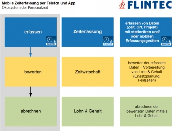 Mit der Flintec Zeiterfassung erfassen Mitarbeiter die Arbeitszeit mobil per App oder Telefon. Bei einer nachgelagerten Zeitwirtschaft gibt Flintec die erfassten Daten zur Bewertung an die Zeitwirtschaft. Bei einer fehlenden Internetverbindung werden die Buchungen offline gespeichert und bei bestehender Internetverbindung an die Zeitwirtschaft weitergegeben. Die Weitergabe erfolgt über ein zertifiziertes ERP-Interface, z.B. PCS DEXICON oder KABA B-COMM. Die Zeitwirtschaft speichert und bewertet die Daten. Anschließend übergibt sie die bewerteten Daten zur Abrechnung an Lohn und Gehalt.