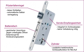 Das Funkschloss ist als Batterie- oder Induktiv-Ausführung erhältlich. Die eingebaute Selbstverriegelung schützt die Türe dauerhaft - eine manuelle Schließung ist somit nicht mehr notwendig. Ein Zylinder mit zusätzlicher Schlüsselfunktion bietet ein Not-Auf. Weitere Vorteile des Funkschlosses sind das leise Schließen und die automatische Selbstverriegelung durch den Flüsterfallenriegel, sowie der gesicherte Verschluss des Batteriefachs gegen unbefugtes Öffnen.