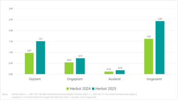 Die Quote der geplanten Betriebsaufgaben stieg von 0,97 Prozent im vergangenen Jahr auf 1,51 Prozent bei der jüngsten Befragung. Ungeplante Geschäftsaufgaben betreffen aktuell 0,73 Prozent der Mandate im Vergleich zu 0,54 Prozent im Jahr 2024. Auslandsverlagerungen wurden für 0,18 Prozent der Mandate genannt, Vorjahr 0,12 Prozent – siehe Grafik.
