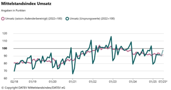 Nürnberg, 20. Aug 2025 - Die Trendwende hin zu einem Aufschwung in der mittelständischen Wirtschaft ist nach wie vor nicht in Sicht. Die Abwärtsentwicklung setzt sich fort. Das zeigen die Daten des aktuellen DATEV Mittelstandsindex. Demnach sind die Umsätze in den kleinsten, kleinen und mittleren Unternehmen in Deutschland im Juli im Vergleich zum Vorjahr um 1,7 Prozent auf 91,9 Punkte gesunken saison- und kalenderbereinigt.
