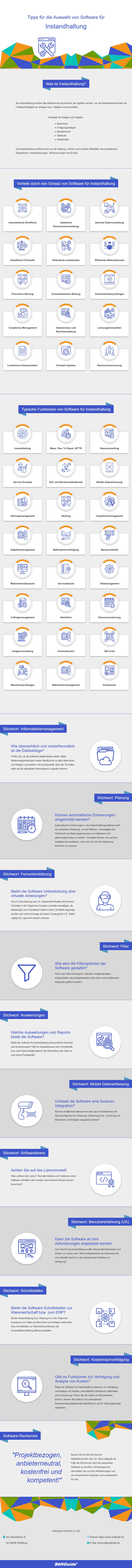 In dieser Infografik zum Thema "Instandhaltung" haben wir Ihnen ausgesuchte Tipps für die Software-Auswahl sowie wichtige Module und Funktionen von Software für die Instandhaltung zusammengestellt. Diese Tipps und Funktionen stellen nur einen Auszug aus den umfangreicheren Informationen unserer Software-Tipps für die Auswahl von Instandhaltungs Software dar.