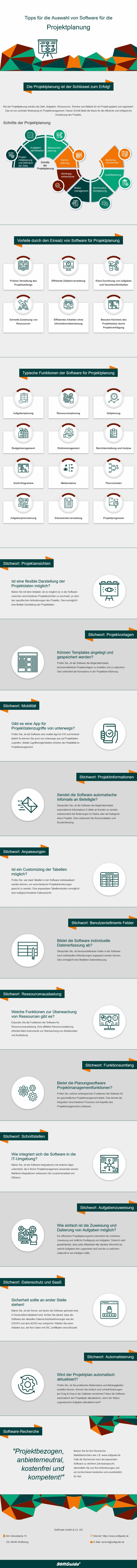 In dieser Infografik zum Thema "Software für die Projektplanung" haben wir Ihnen ausgesuchte Tipps für die Software-Auswahl sowie wichtige Module und Funktionen von Software für die Projektplanung zusammengestellt. Diese Tipps und Funktionen stellen nur einen Auszug aus den umfangreicheren Informationen unserer Software-Tipps für die Auswahl von Projektplanungs Software dar.