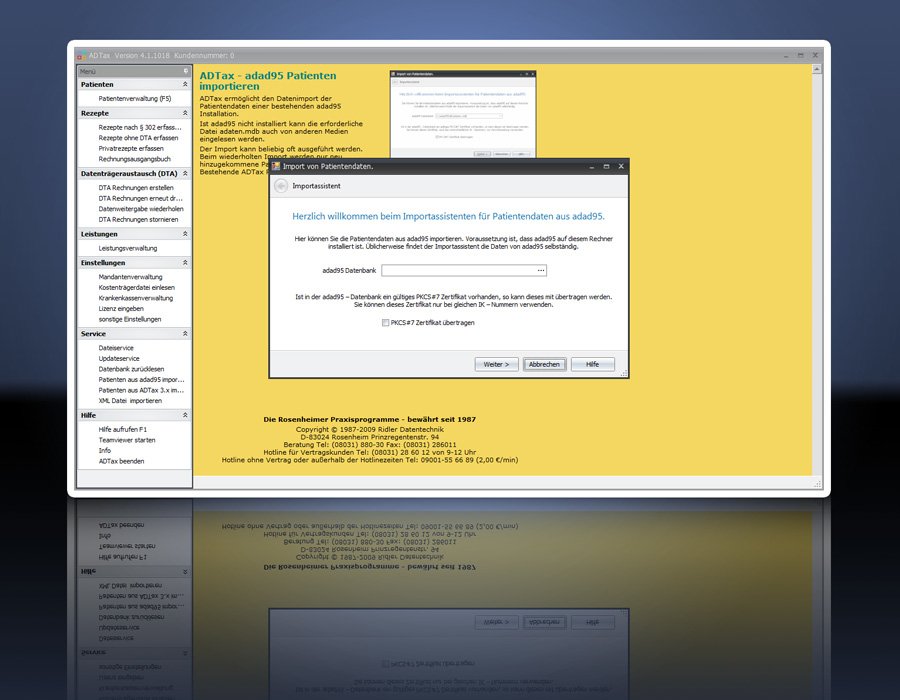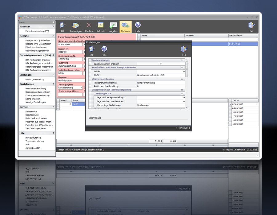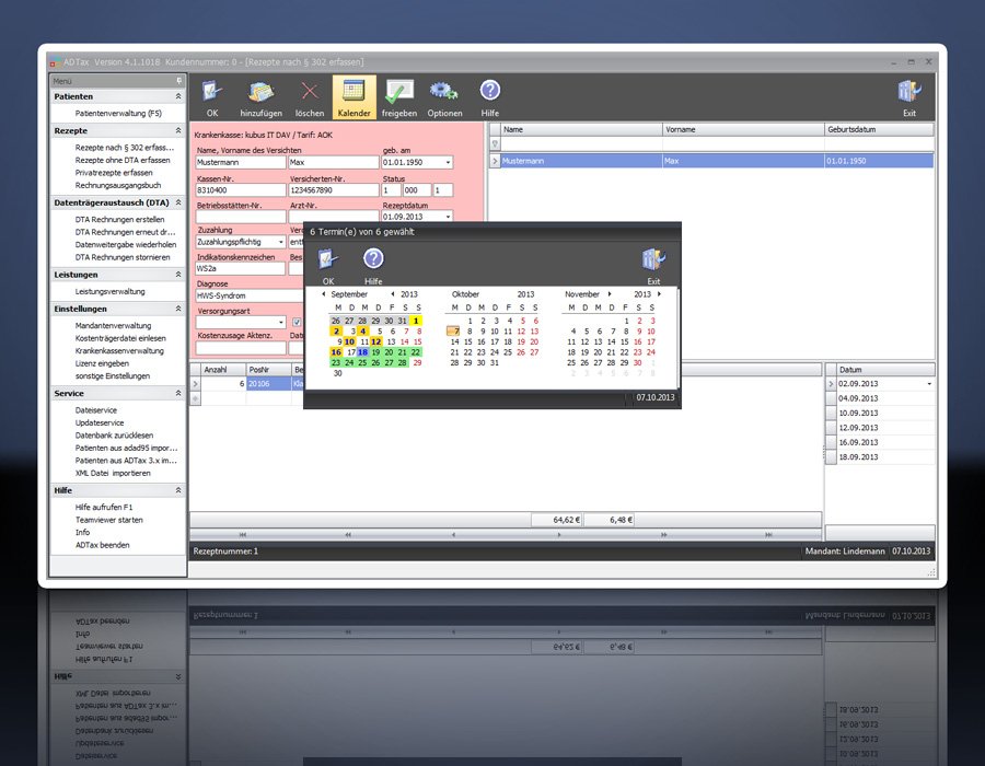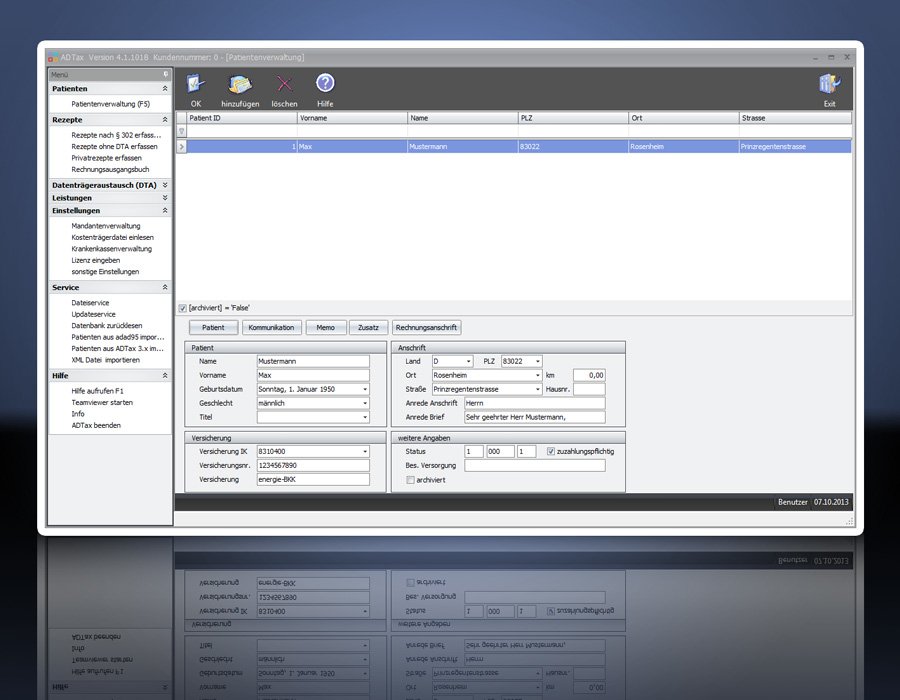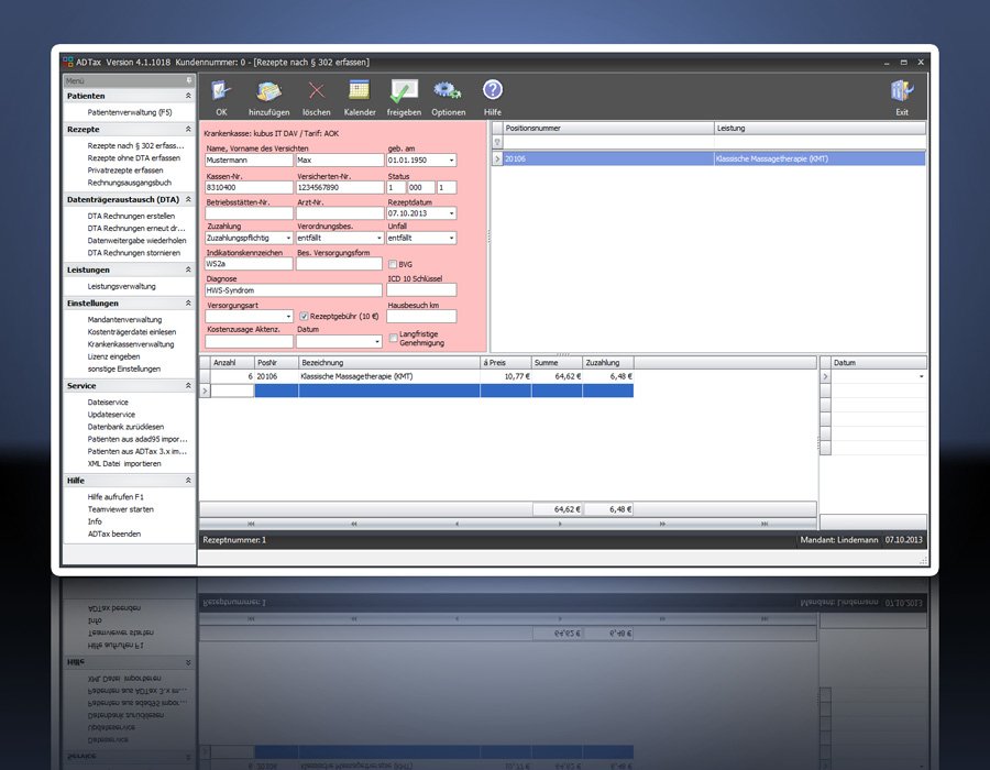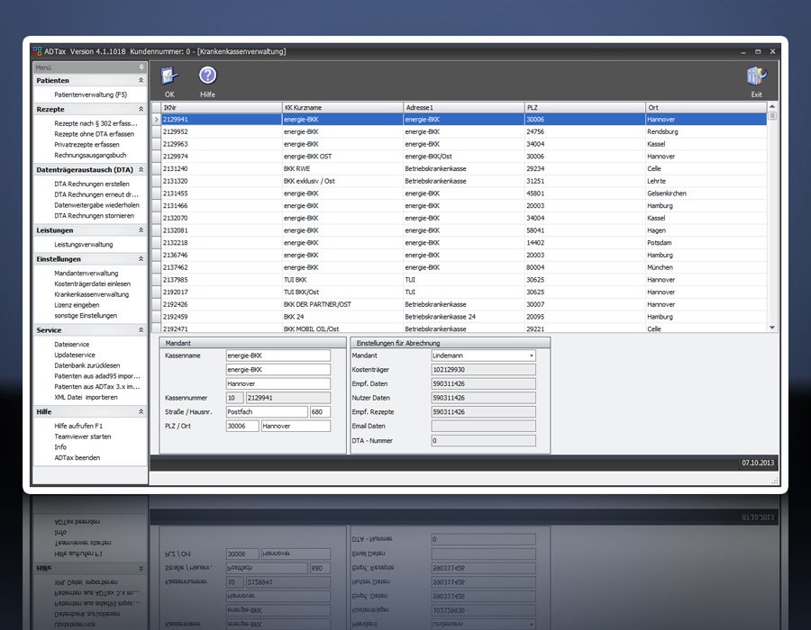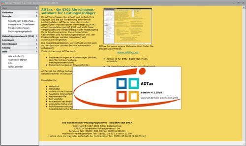 Mit ADTax erfassen Sie auch die Verordnungs- und Leistungsdaten für Rezepte von Kostenträgern die nicht am Datenträgeraustausch nach §302 teilnehmen. Zu dieser Gruppe gehören z.B. die Berufsgenossenschaften, die Wehrbereichsverwaltung, Polizei, Bundesgrenzschutz, und Post - A Versicherte etc. Neben den Patientendaten werden auch die Kostenträgerdaten einzeln gespeichert und stehen bei künftigen Verordnungen zur Verfügung.