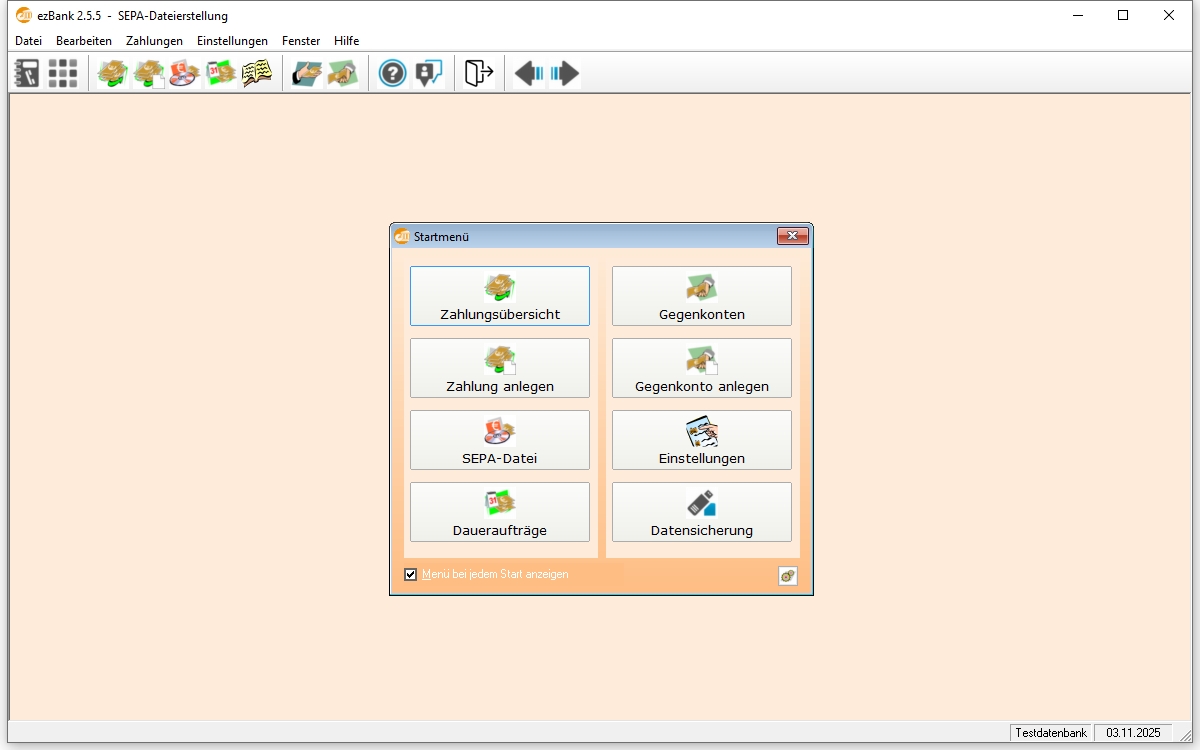 ezBank ist eine leistungsstarke und praxisorientierte Softwarelösung zur Erfassen von Zahlungen und zum Erstellen der SEPA-Dateien oder auch DTAUS-Dateien für den elektronischen Zahlungsverkehr mit der Bank, sowohl für Überweisungen wie auch für Basis-Lastschriften und Firmenlastschriften. Die Übertragung der Bankdateien an die Bank erfolgt meist direkt über das Online-Banking-Portal Ihrer Bank. Sie kann auch mittels einer geeigneten Software, z.B. StarMoney oder SFIRM von der Kreissparkasse oder db-direct MC erfolgen.