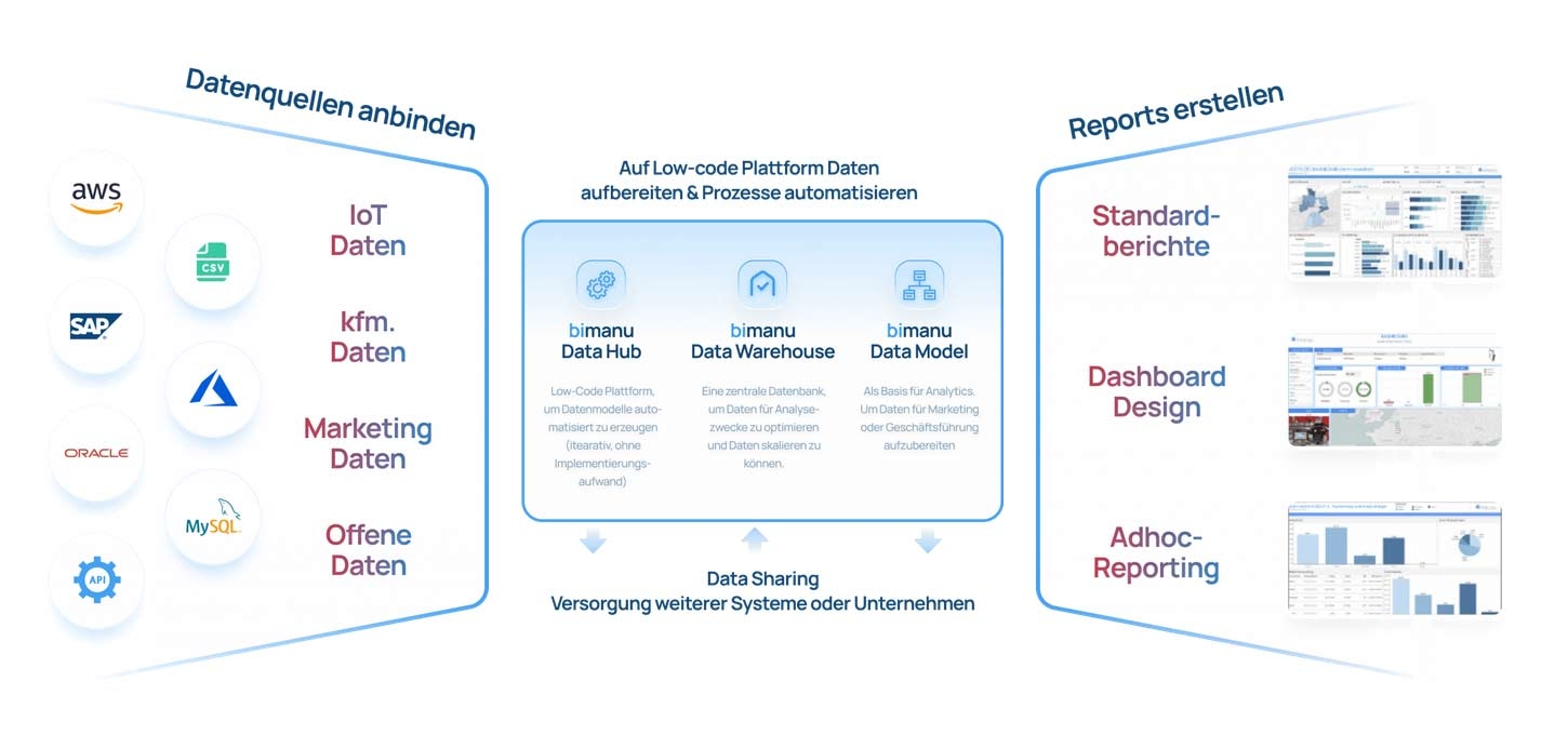 bimanu Cloud ist eine cloudbasierte Low-Code-Plattform für Business Intelligence und Data Warehousing. Sie hilft Ihnen, Daten aus unterschiedlichen Quellen wie ERP, CRM und IoT-Systemen zentral zu integrieren, automatisiert aufzubereiten und für Analysen nutzbar zu machen. Damit ersetzen Sie manuelle Excel-Prozesse und Datensilos durch eine konsolidierte Datenbasis als verlässliche Grundlage für Entscheidungen.