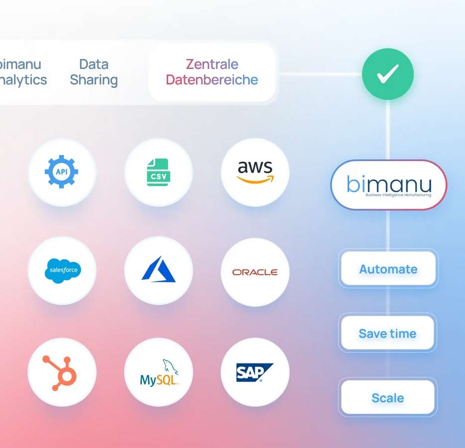 bimanu Cloud verfügt über mehr als 50 vorkonfigurierte Konnektoren für ERP‑, CRM‑ und IoT‑Systeme. Diese verbinden Ihre Datenquellen, synchronisieren sie in Echtzeit und sorgen durch Fehlerbehandlung und Monitoring für eine hohe Datenqualität.