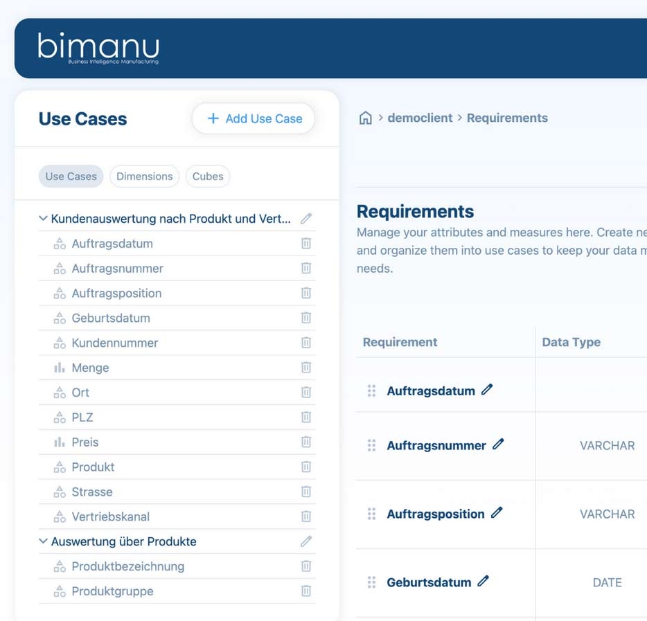 Wenn Sie eine Lösung suchen, die Datenintegration, Data Warehouse und Business Intelligence in einer Plattform vereint, bietet bimanu Cloud einen pragmatischen Weg zu belastbaren Analysen. Sie erhalten eine skalierbare Datenbasis, auf der Reporting und Dashboards konsistent aufsetzen und die zugleich den nächsten Schritt Richtung KI-Analytik ermöglicht.