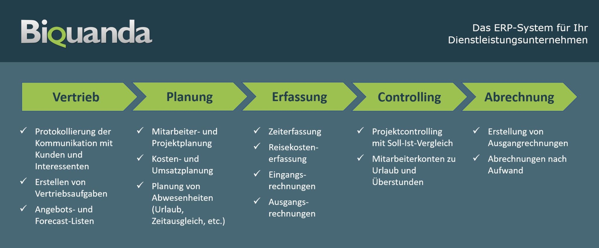 Biquanda unterstützt die Projektabwicklung in Dienstleistungsunternehmen. Eine leistungsstarke und flexible Mitarbeiter- und Projektverwaltung bildet die Basis für eine Mitarbeiter- und Projektplanung in Balkenform oder die Erfassung von Projektzeiten und -kosten. Über umfangreiche Auswertungen kann jederzeit auf den aktuellen und geplanten Projektstand zugegriffen werden. Ferner erfolgt mit Biquanda die Urlaubs- und Stundenverwaltung der Mitarbeiter sowie die Abrechnung von Dienstleistungsprojekten.