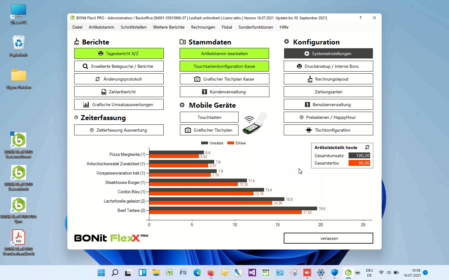 BONit FlexX PRO ist eine moderne Registrierkassensoftware und läuft auf den meisten aktuellen Windows Computern mit Windows 10 und unterstützt bereits das neue Windows 11 mit allen Funktionen. Wir haben natürlich auch verschiedene, optimal abgestimmte Komplettsets für Sie im Sortiment.