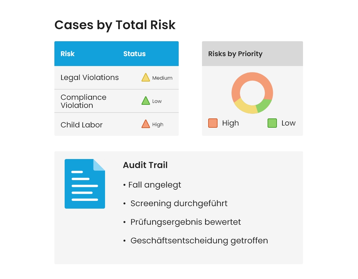 Durch intelligente Screening- und Monitoring-Prozesse erkennt das System frühzeitig potenzielle Risiken und gewährleistet eine lückenlose Dokumentation für Audit- und Prüfzwecke.