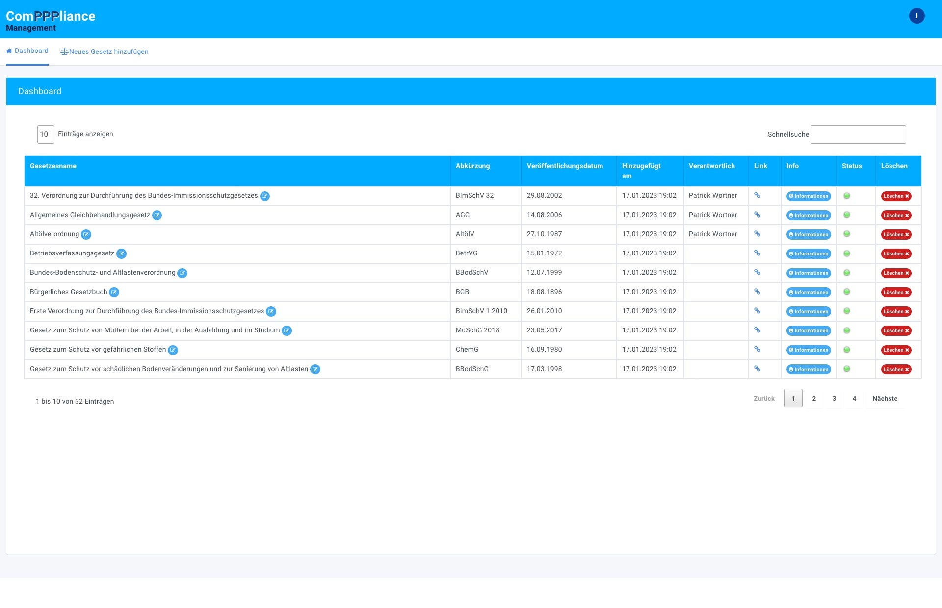 ComPPPlianceManagement ist ein Softwarelösung, die Unternehmen dabei unterstützt, ihre Compliance-Prozesse effizient zu überwachen und zu optimieren. Die Anwendung automatisiert das Live‑Monitoring gesetzlicher Vorgaben über eine Schnittstelle zum Bundesamt für Justiz und erlaubt zusätzlich das manuelle Hinzufügen weiterer Gesetze, Verordnungen und interner Richtlinien.
