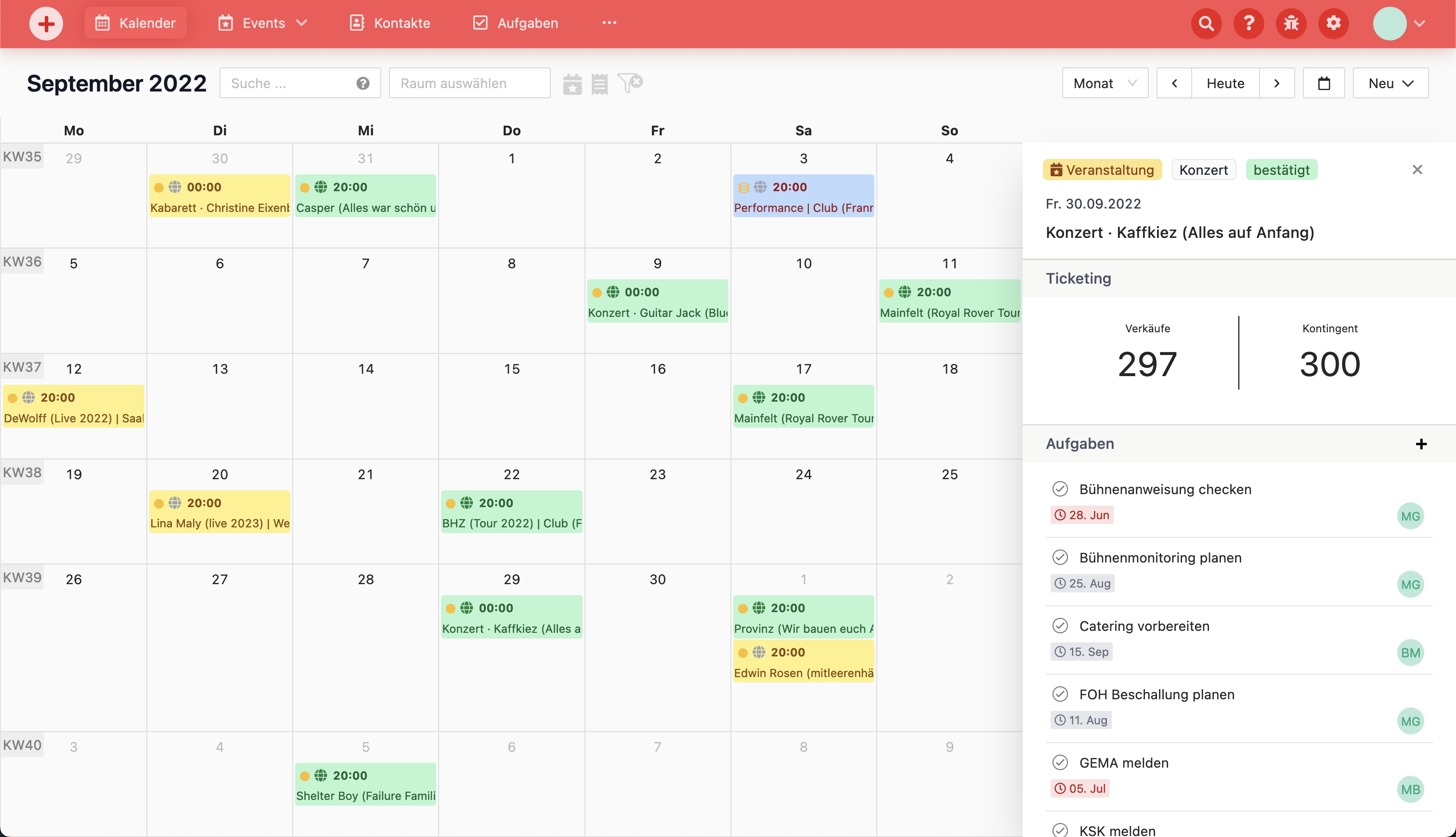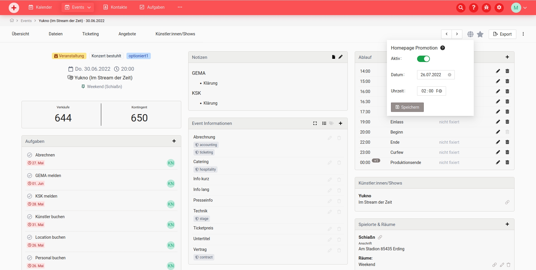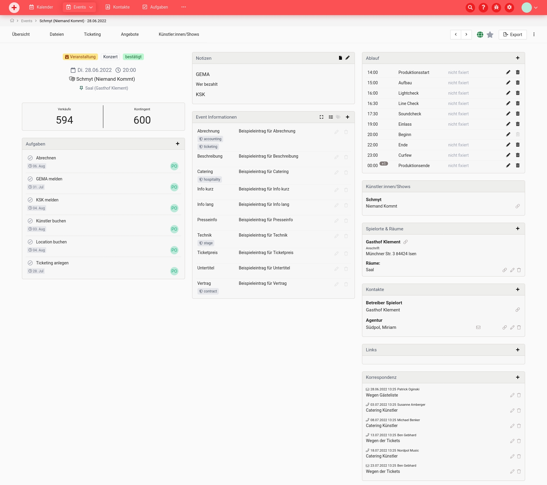 Event-Dashboard: Alle Event-Informationen auf einen Blick (u. a. Ticketing, Aufgaben, Notizen, Ablauf, Künstler/Programm, Räume, Kontakte, Links und Korrespondenz)