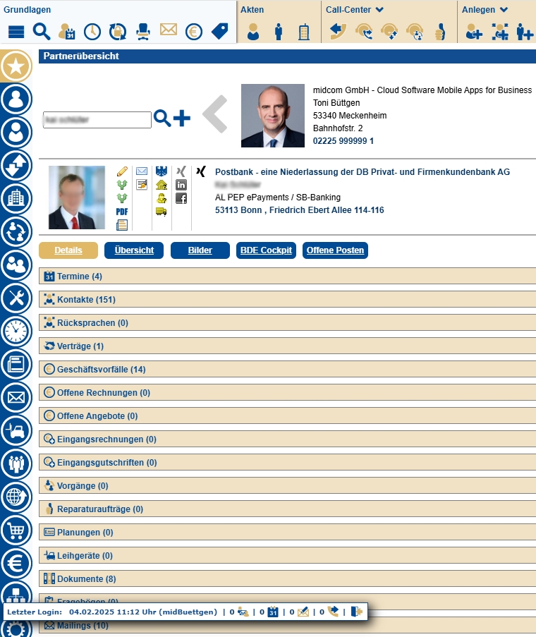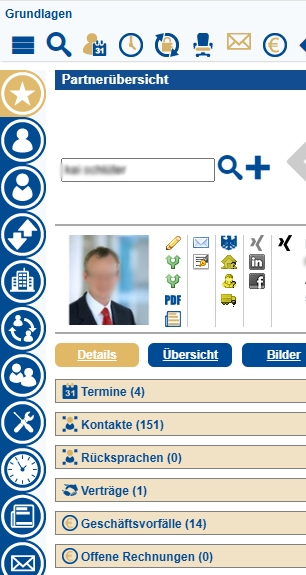 360°-Kunden- und Partnerakte: Einheitliche Oberfläche für Stammdaten, Kommunikation, Belege, Vorgänge, Projekte, Historien, Adressänderungen und besondere Prüfungen.