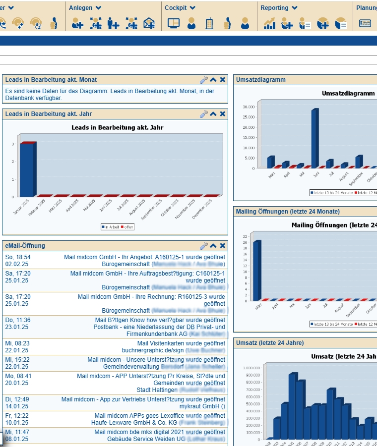 Personalisierte Dashboards: Top-Kundenlisten, Umsatz- & Kostenverläufe, Lead-/Opportunity-Pipelines, Auftrags- und Bestellstatistiken, Dialog-KPIs (E-Mail-Öffnungen, Telefonkontakte) und Controlling-Widgets.