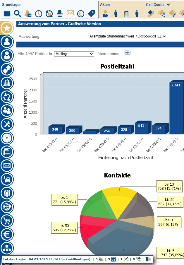 Kampagnen & Besuchsplanung: Zeitgesteuerte E-Mailings inkl. Öffnungstracking, Serienbriefe, Kunden-Tourenplanung mit Google-APIs (Entfernung/Routen/Nächster Kunde).
