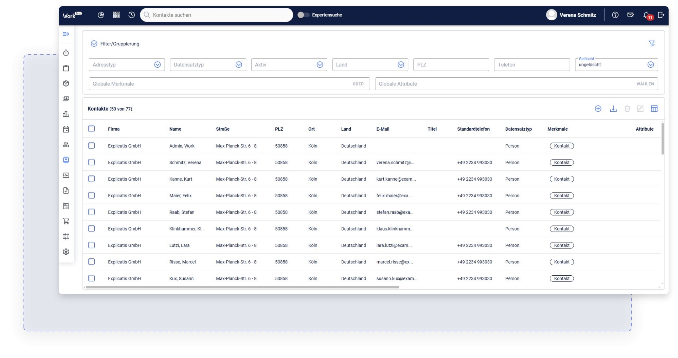 Gutes Kontaktmanagement ist die Grundlage für effektive Kommunikation und den Aufbau stabiler Beziehungen im professionellen Projektgeschäft. Alle Stammdaten, Adressen, Kontaktdetails und Ansprechpartner werden zentral gespeichert und können bei Bedarf exportiert werden. Kontakte können mit Adressen, Ansprechpartnern, Projekten und individuellen Merkmalen verknüpft werden. Auch Gesprächsnotizen, Verträge, Dokumente oder Beziehungen können direkt aus der Kontakt- oder Projektmaske geöffnet und bearbeitet werden.