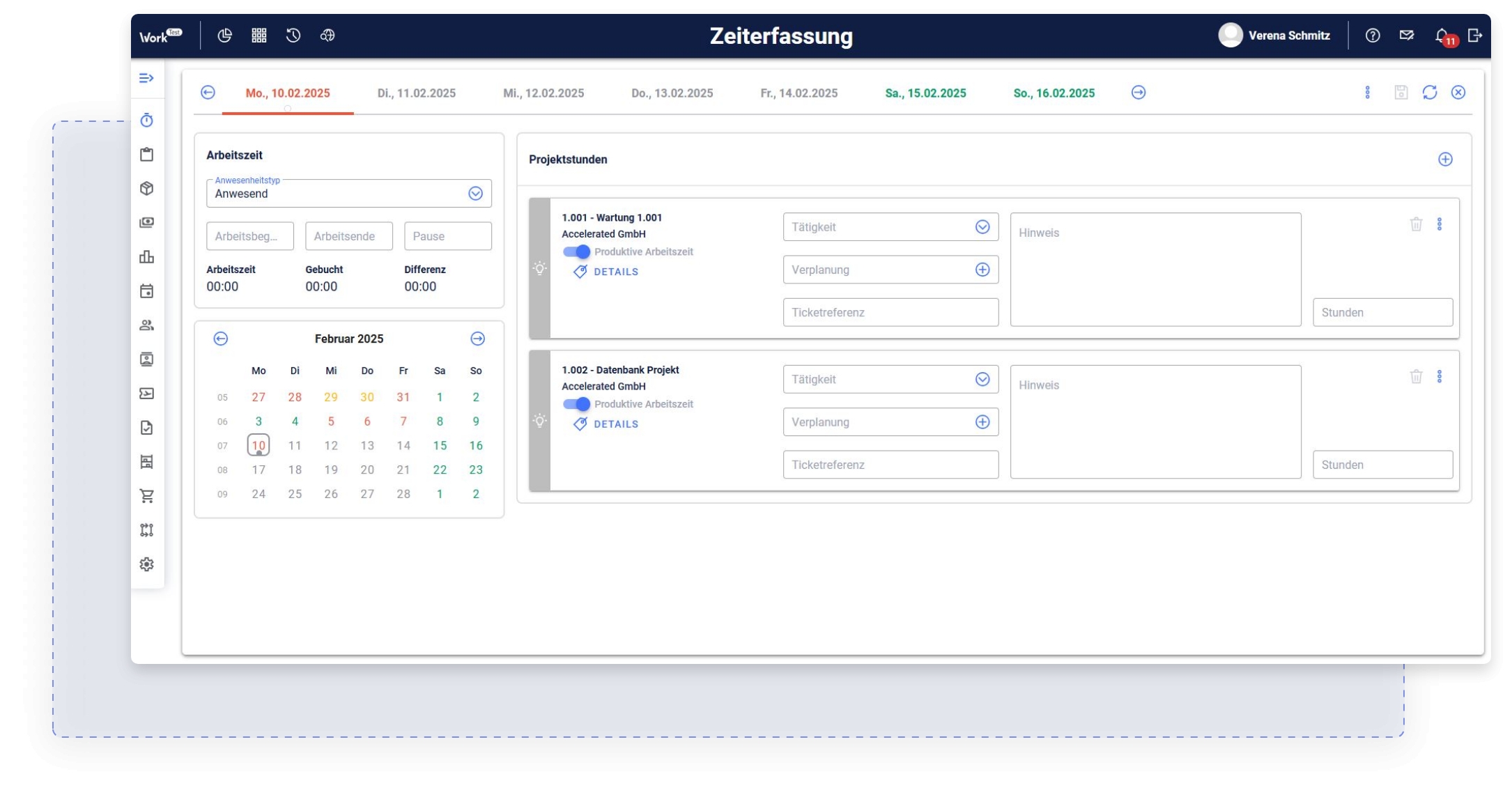 Mit unserer Cloud ERP-Software können Sie die Arbeitszeiten Ihrer Mitarbeiter vollkommen unkompliziert und direkt in den Arbeitsablauf integrieren. Egal ob per PC, Laptop, Tablet oder Smartphone - die Zeiterfassung erfolgt schnell und einfach, ohne den Arbeitsfluss zu unterbrechen. Unsere Software unterstützt Sie dabei, die Arbeitszeit Ihrer Mitarbeiter transparent und präzise zu erfassen und gibt Ihnen wertvolle Einblicke in die Auslastung Ihrer Ressourcen.