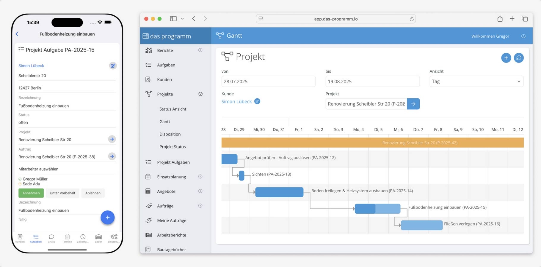 Ja. Das Programm läuft im Browser am PC und zusätzlich über eine Handwerker-App auf Smartphone und Tablet. Die Lösung ist speziell für die mobile Nutzung im Handwerksalltag gedacht, im Büro online und auf der Baustelle auch offline, sodass Sie Aufmaße, Zeiten und Berichte direkt vor Ort erfassen können.