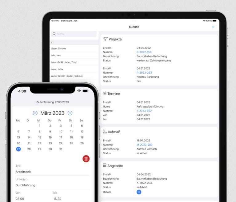 Zentrale Datenbasis für Kunden, Projekte, Aufträge, Leistungen und Materialien