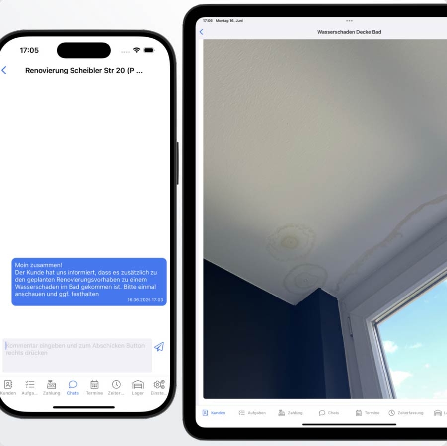 Vor Ort (online & offline): Aufmaßfunktionen für unterschiedliche Gewerke, mobile Arbeitsberichte (Reparatur, Wartung, Zusatzleistungen), Abnahmeprotokolle, Bautagebuch zur Dokumentation und Koordination, Chat- und Dokumentationsfunktionen, Cloud-Speicher für projektbezogene Unterlagen, mobiles Bezahlen beim Kunden sowie flexible mobile Zeiterfassung.
