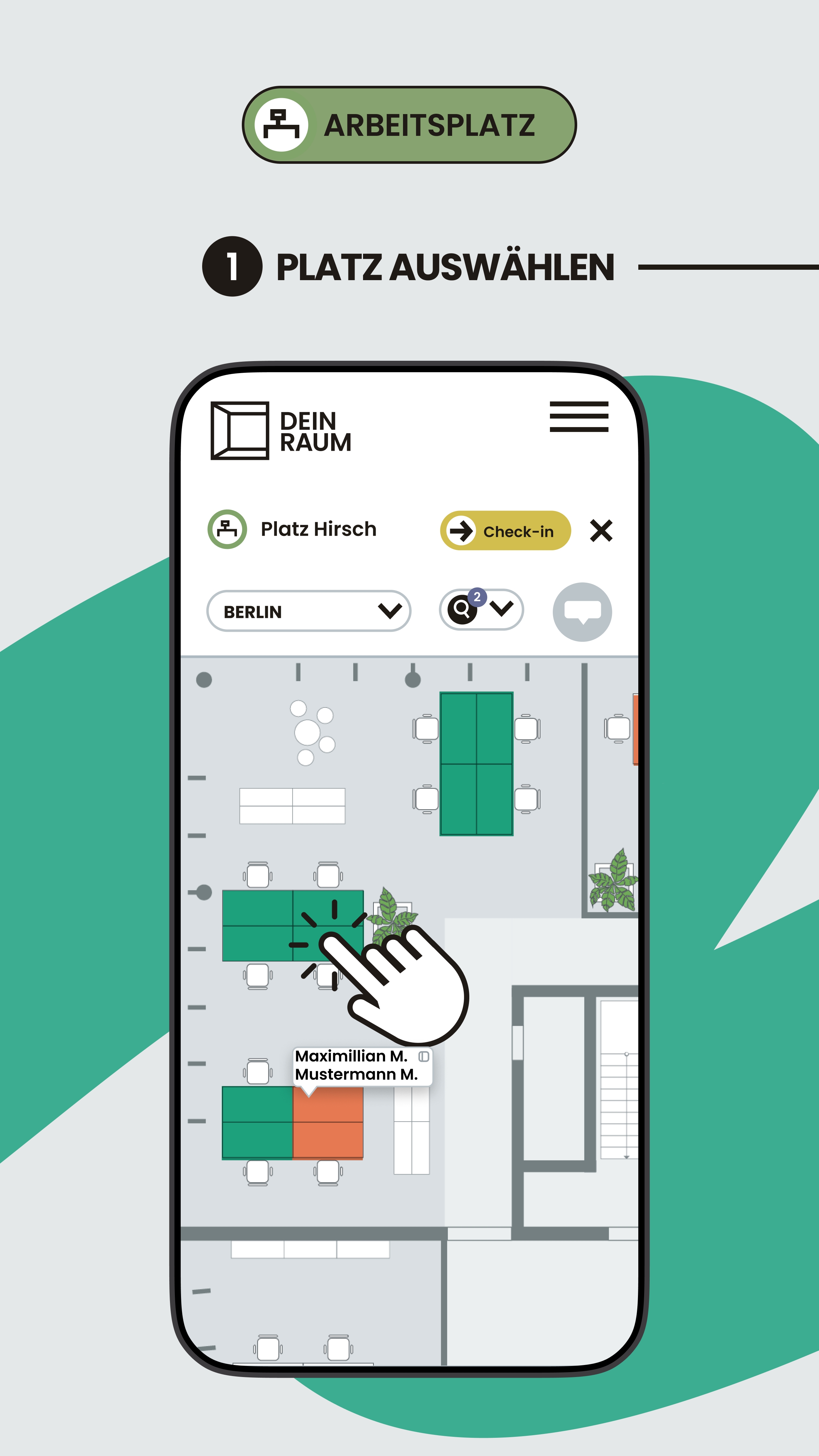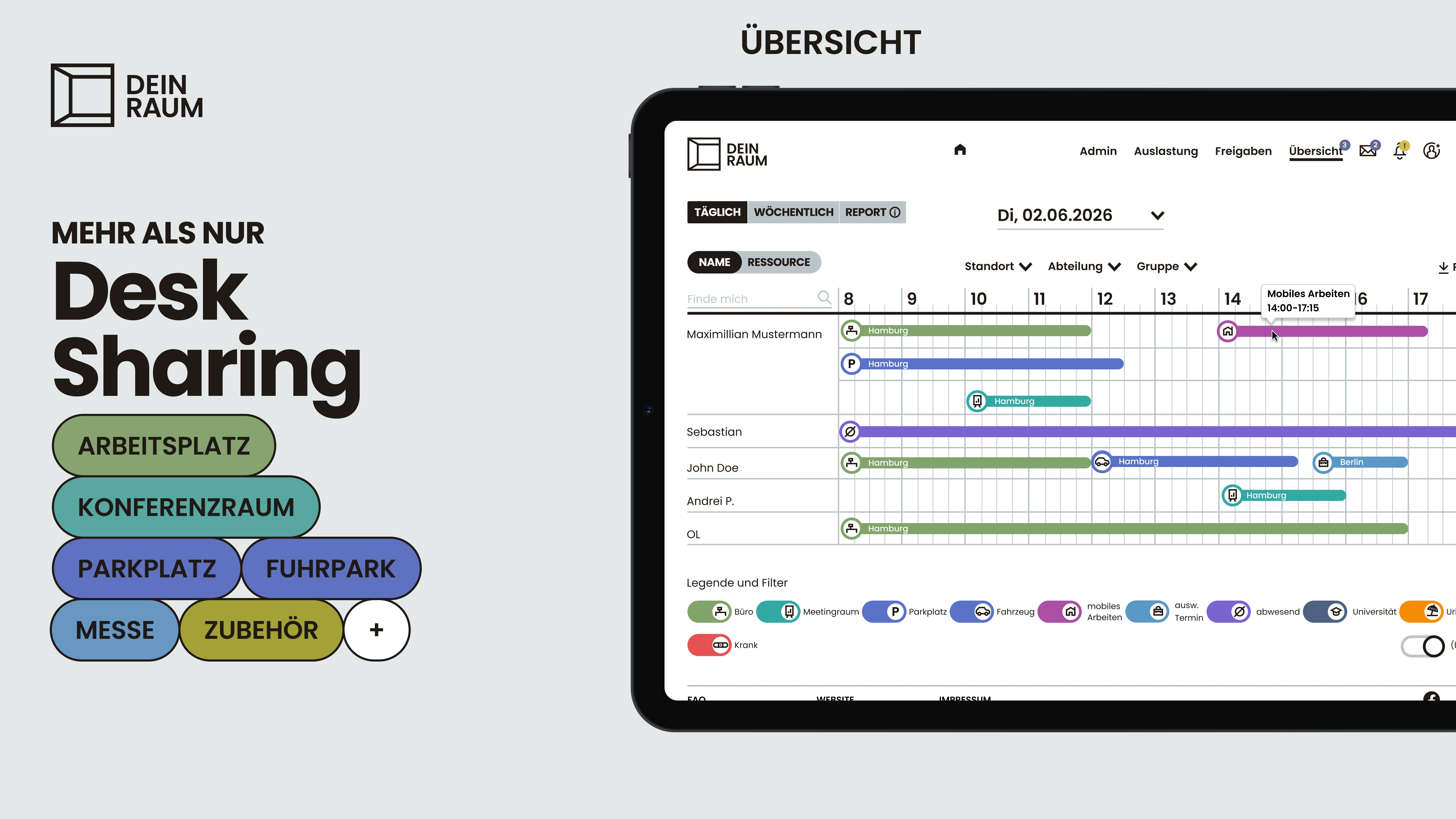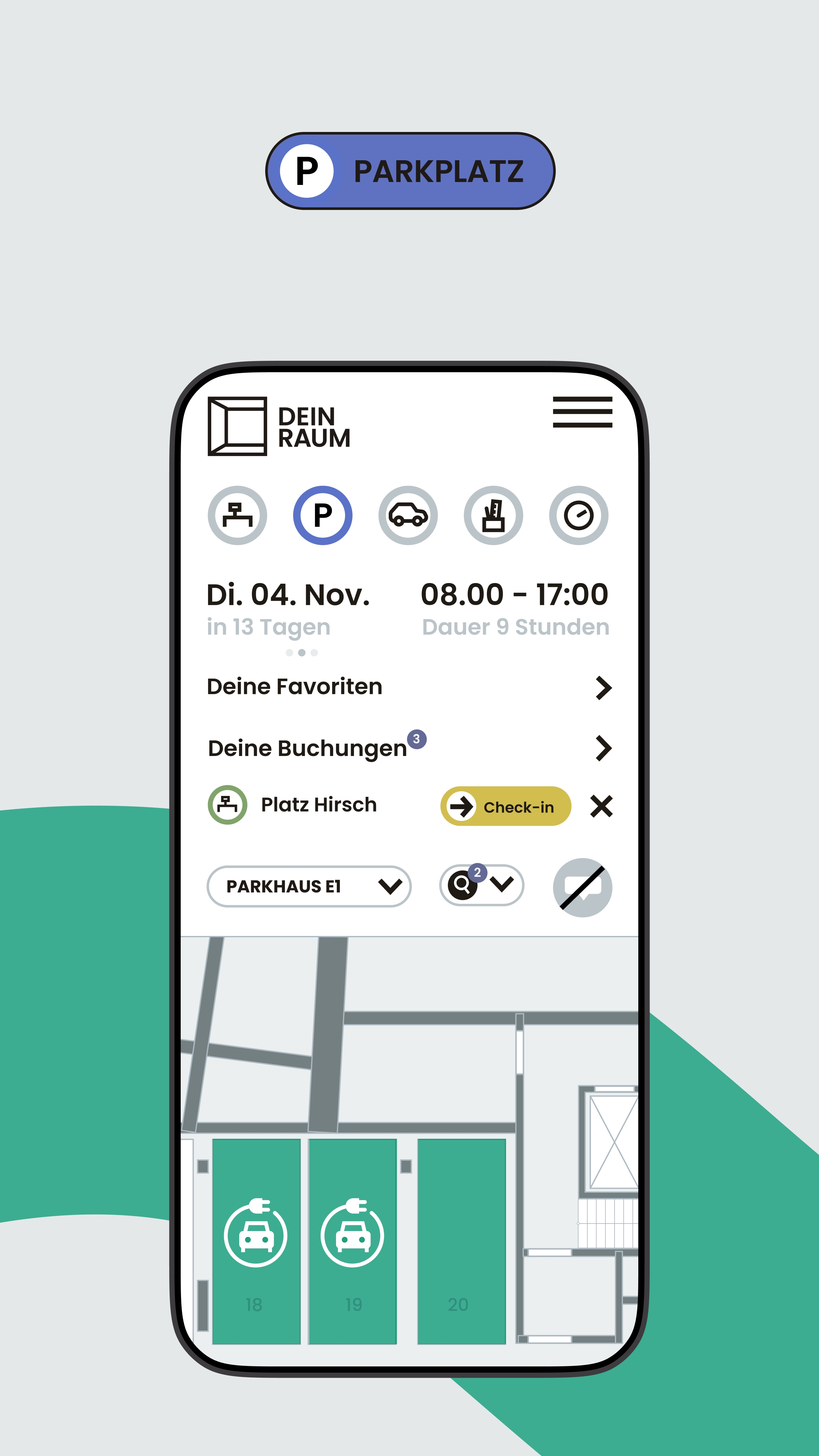 DEIN RAUM ist eine Desksharing-Software, mit der Sie hybride Arbeit strukturiert organisieren und flexible Arbeitsumgebungen zuverlässig steuern. Mitarbeitende buchen Arbeitsplätze, Konferenzräume oder Parkplätze digital – bequem über Smartphone, Tablet oder Desktop. Statt fester Zuordnungen schaffen Sie damit klare Regeln, Transparenz und eine planbare Anwesenheit im Büro, ohne die Flexibilität moderner Arbeitsmodelle einzuschränken.
