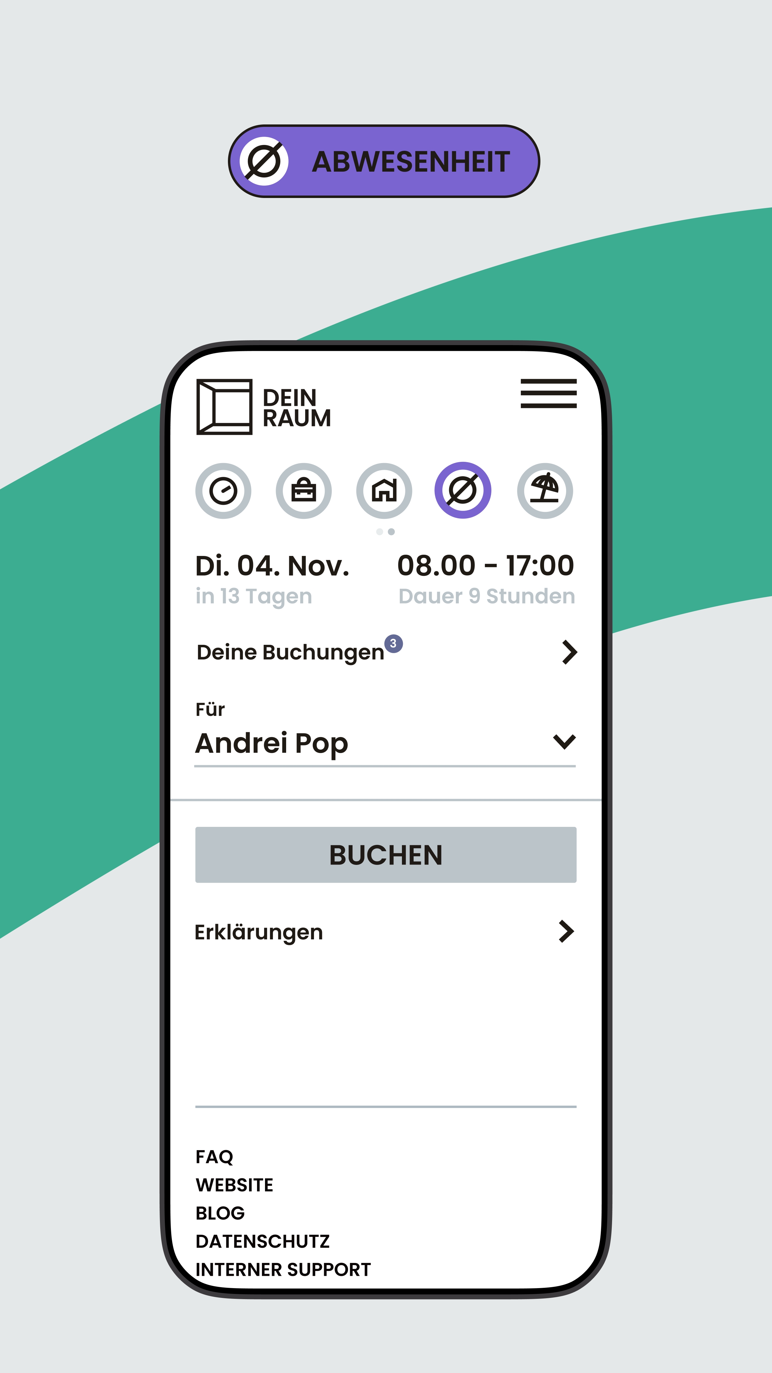 „Woanders“-Status (z. B. Homeoffice/auswärts/abwesend) und optional anonymes Buchen