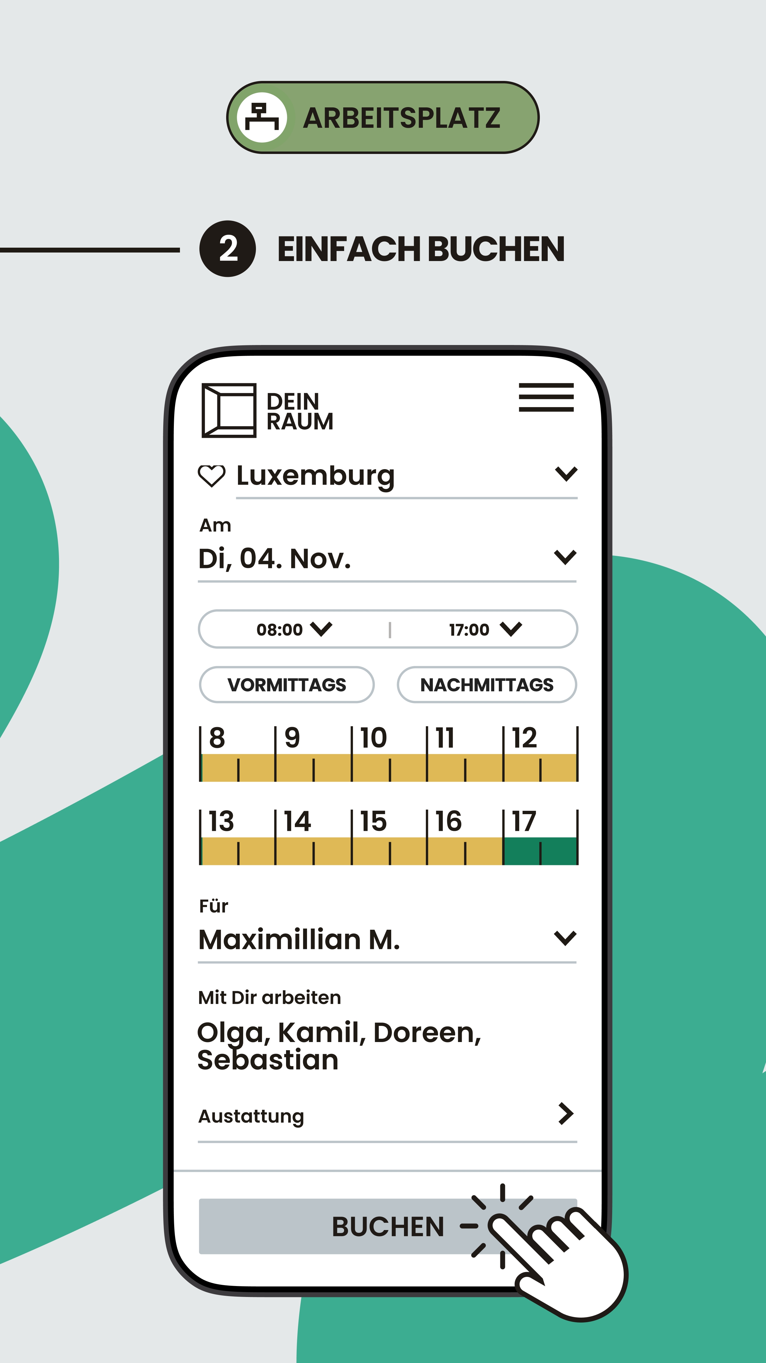 Mitarbeitende wählen einen Platz im Grundriss oder in einer Liste, definieren das Zeitfenster und bestätigen die Buchung.
