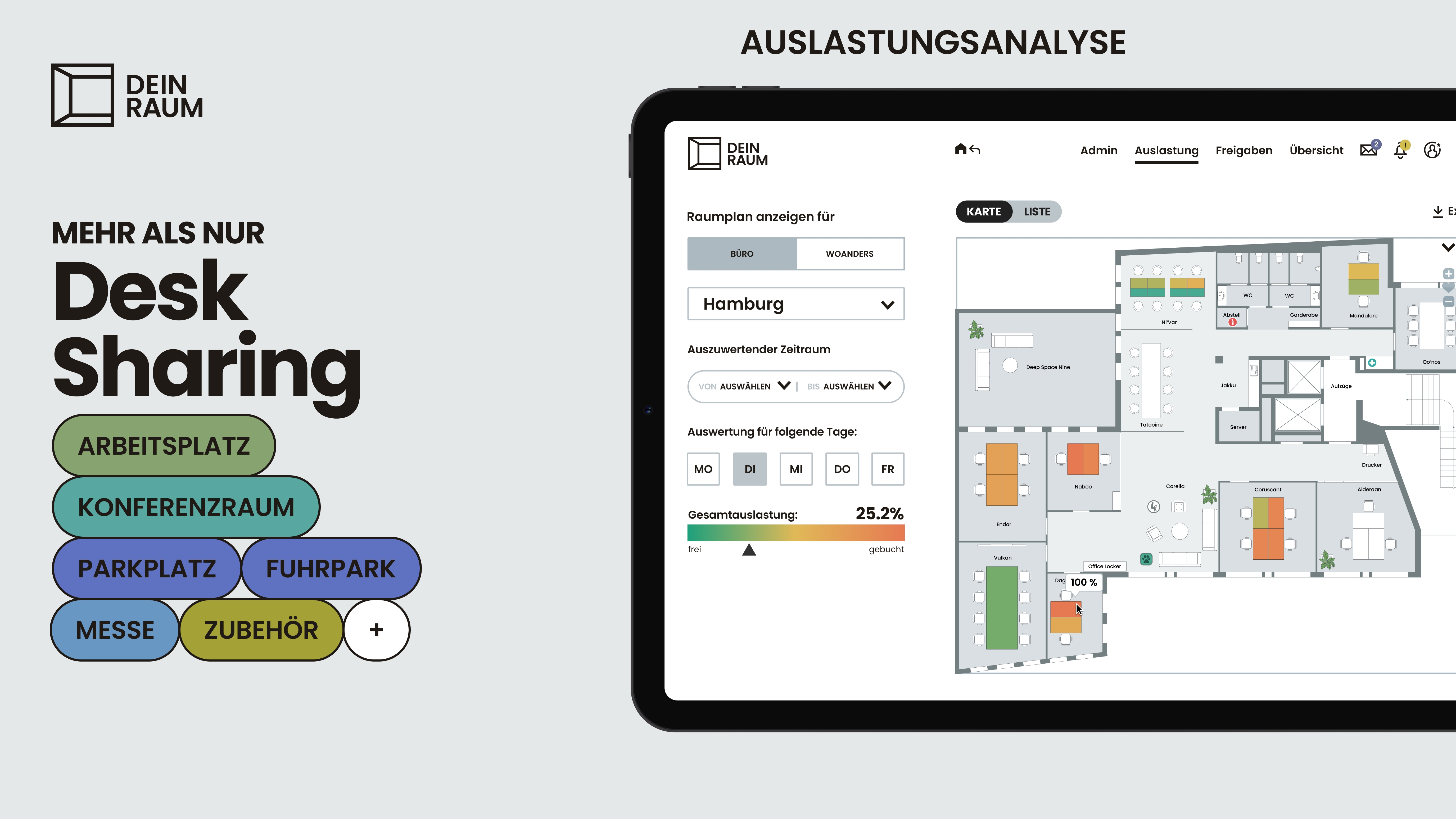 Arbeitsplatz-, Konferenzraum- und Parkplatzbuchung (Grundriss & Liste)