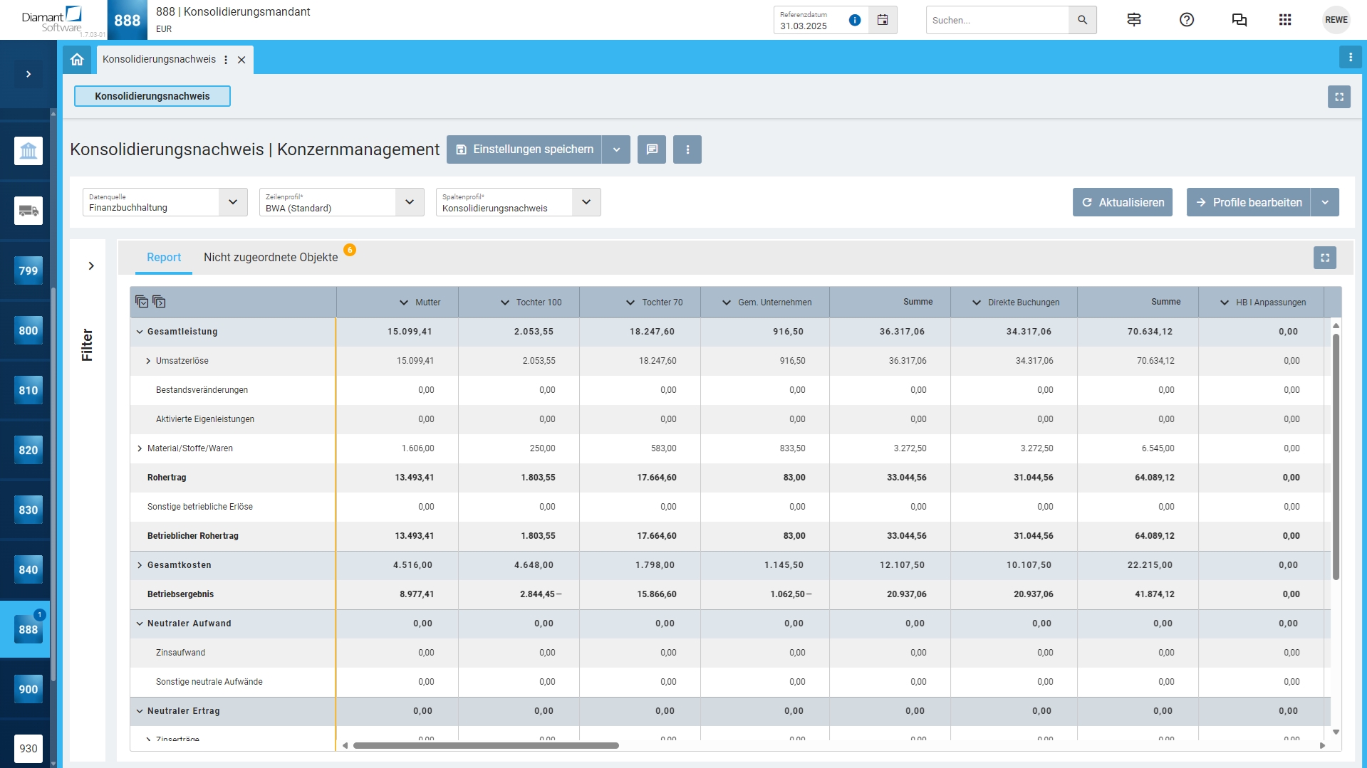 Mit Diamant/4 optimieren Sie Ihre Buchhaltungsprozesse über mehrere Mandanten hinweg und gelangen effizient zum prüfungssicheren Konzernabschluss. Statt sich mit zeitraubenden Routinetätigkeiten aufzuhalten, gewinnen Sie verlässliche Zahlen und fundierte Einblicke in die wirtschaftliche Lage Ihrer Unternehmensgruppe. Die Lösung vereint relevante Daten aller verbundenen Einheiten, schafft Transparenz und unterstützt Sie bei der Einhaltung gesetzlicher Anforderungen.
