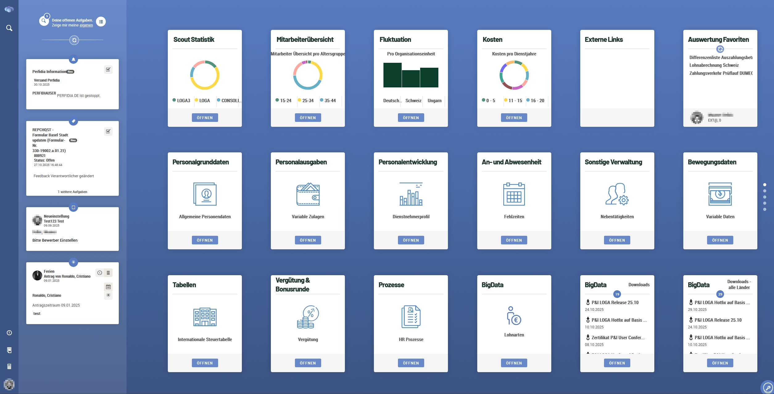 Vorgefertigte HR-Kennzahlen (z. B. Fluktuation, Abwesenheiten, Headcount) sowie flexible Auswertungen und Exporte. Dashboards schaffen Transparenz für HR und Management.