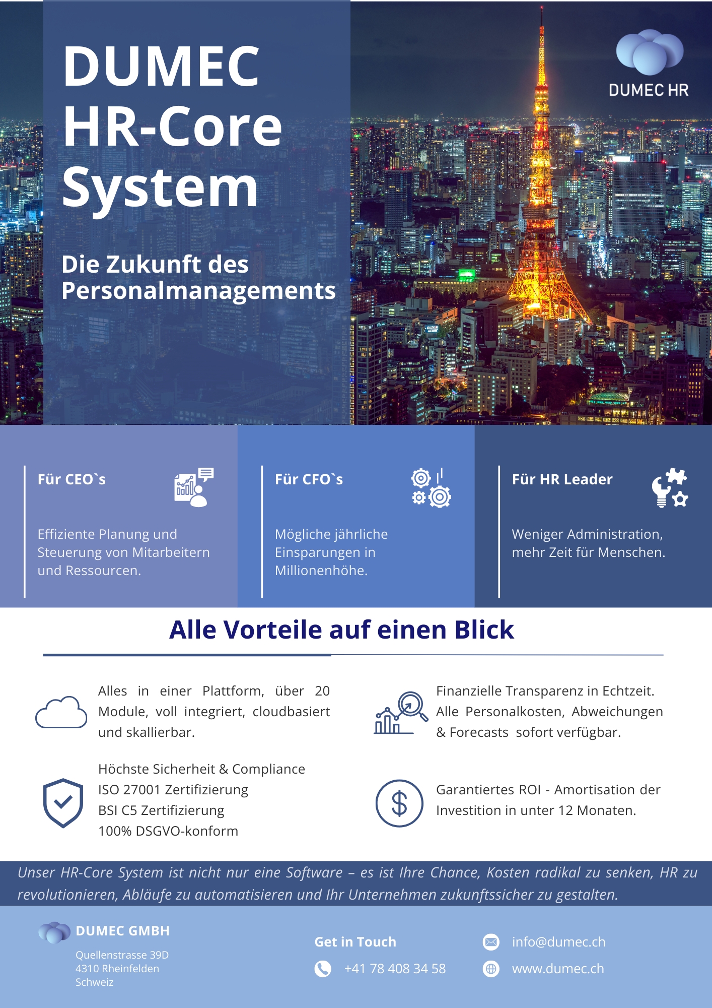 DUMEC Cloud HR ist eine modular aufgebaute HR-Komplettlösung für Unternehmen vom Mittelstand bis zum Konzern. Die Software digitalisiert durchgängige Personalprozesse - von der digitalen Personalakte über Recruiting und Onboarding bis hin zu Zeitwirtschaft, Zutrittskontrolle, Payroll und Personalentwicklung. Dank flexibel kombinierbarer Bausteine wächst die Lösung mit Ihren Anforderungen und unterstützt datenbasierte Entscheidungen im HR-Alltag.