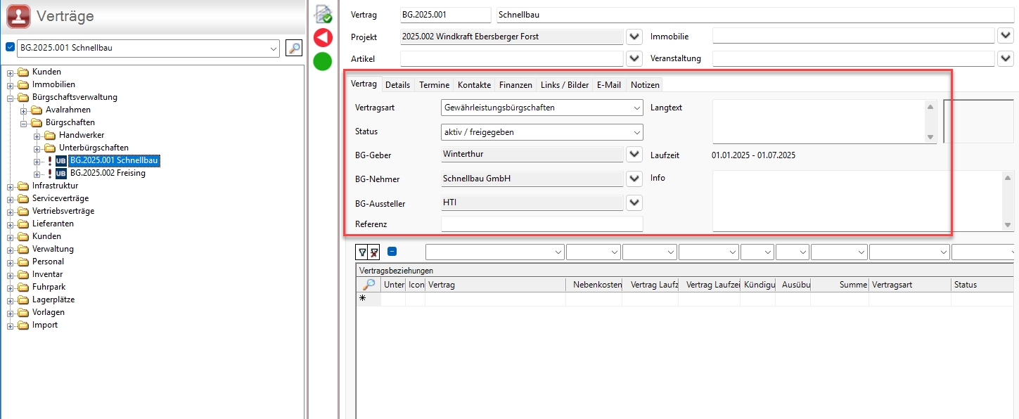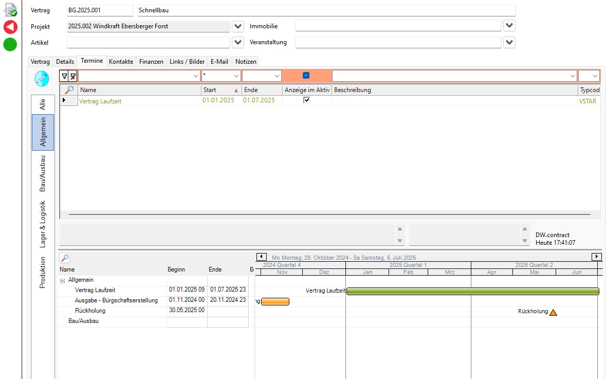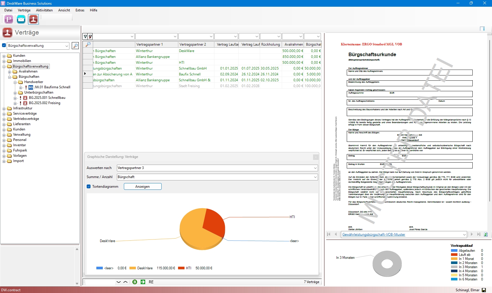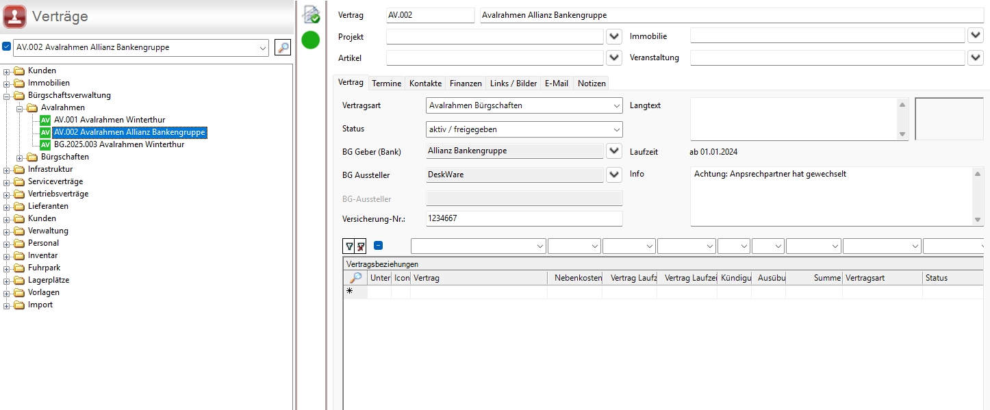 Die Anwendung Bürgschaften in DW.contract hilft Ihnen, jederzeit den Überblick über freie Avalrahmen und Laufzeiten oder Konditionen Ihrer Bürgschaften, Sicherheiten, Termine & Fristen zu behalten. So haben Sie alle Bürgschaften und Einbehalte stets im Blick. Der Bürgschaftsrahmen wird überwacht und alle Fristen und Termine genau verfolgt. Die Bürgschaftsverwaltung ist zentral abgelegt und immer aktuell. Die Datenbestände sind transparent und nachvollziehbar. Die offenen Avalrahmen sind stets sichtbar und auswertbar. Alle Abteilungen, ob Buchhaltung, Geschäftsführung, Projektleitung können wichtige Informationen für ihre tägliche Arbeit per Knopfdruck erhalten und Arbeitsprozesse werden beschleunigt und die Absicherung von der Auftragsvergabe bis hin zum Ende der Gewährleistungsfrist gesichert. Dadurch lassen sich Bürgschaften zeit- und kostensparend verwalten, ohne Risiken und Versäumnisse.Arbeitsweise im Team ohne aufwendig zu pflegende Excel Dateien - wirtschaftlich gesehen in kürzester Zeit amortisiert!