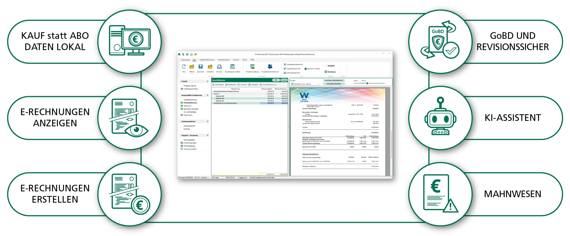 Mit E-Rechnung 2025 sparen Sie Zeit und Kosten, indem Sie Ihre Rechnungsprozesse digitalisieren und automatisieren. Die manuelle Fehlerquote wird deutlich reduziert, und Sie haben jederzeit einen transparenten Überblick über offene Forderungen und Zahlungseingänge. Dank der lokalen Installation genießen Sie volle Datensicherheit, ohne von externen Servern oder Cloud-Lösungen abhängig zu sein.
