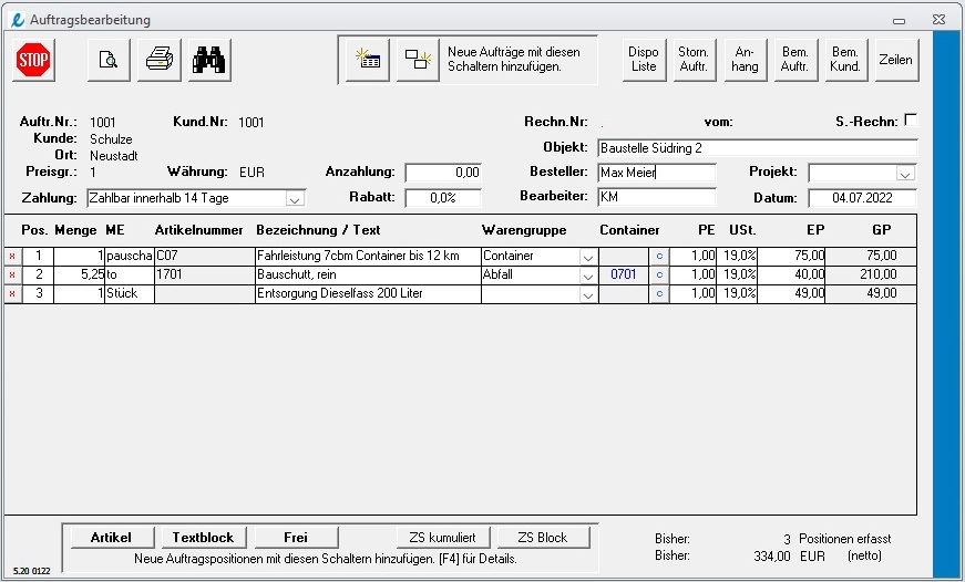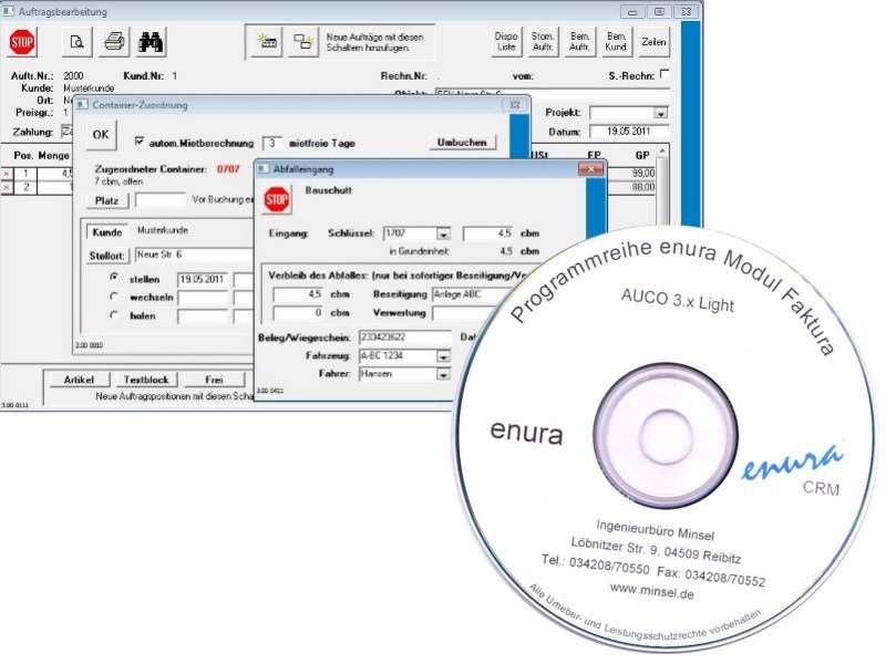 Von der Auftragserfassung über den Rechnungsdruck bis zum Mahnwesen bietet enura AUCO Light alle notwendigen Funktionen für kleine Containerdienste. Wie bei Branchenlösungen üblich, werden zuerst Stammdaten angelegt, die danach für alle Programmteile zur Verfügung stehen. Das Anlegen von neuen Aufträgen ist dann sehr einfach, von der Kundenauswahl bis zur gedruckten Rechnung - mit nur ein paar Mausklicks.