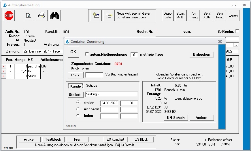 Wir bieten eine einfach zu bedienende Komplettlösung zu einem akzeptablen Preis. Das Programm beschränkt sich in Funktionsumfang und Anforderungen auf das Wesentliche: Druck von Liefer- und Rückholscheinen, Rechnungen (Gutschriften) oder Sammelrechnungen, Containermietrechnungen, offene Postenverwaltung mit Mahnwesen, Betriebstagebuch und Abfallbilanzen, positionsbezogene Mehrwertsteuersätze usw. Die Containerverwaltung als Bestandteil der Auftragsbearbeitung bietet die genaue Übersicht über Standorte und Standzeiten der Wechselcontainer. Darüber hinaus können alle Entsorgungsvorgänge mitprotokolliert werden. Bei jedem Container wird die Abfallart, die Menge sowie Angaben zur Herkunft und Verbleib gespeichert. Das Betriebstagebuch und die Abfallbilanz können über einen beliebigen Zeitraum ausgedruckt werden.