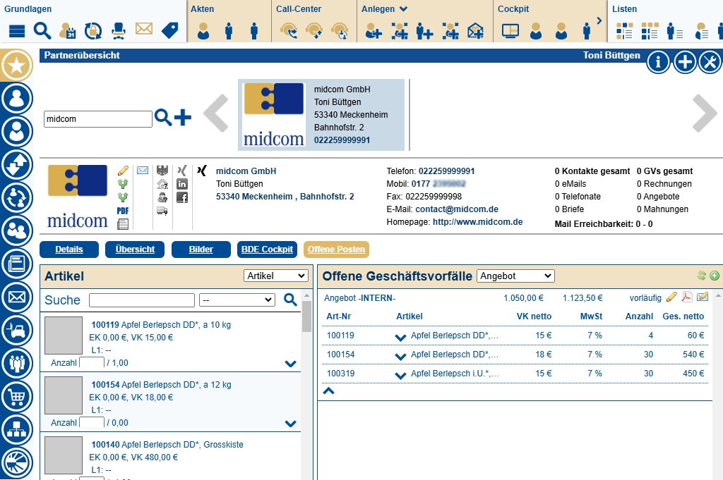 CRM/ERP & Faktura: Kunden-/Kontaktdatenbank, Aktivitäten/Dokumente, Angebot/Bestellung/Rechnung/Lieferschein inkl. ZuGFeRD-Standard, Fakturalisten, E-Mail-Scanner und Vorlagen.