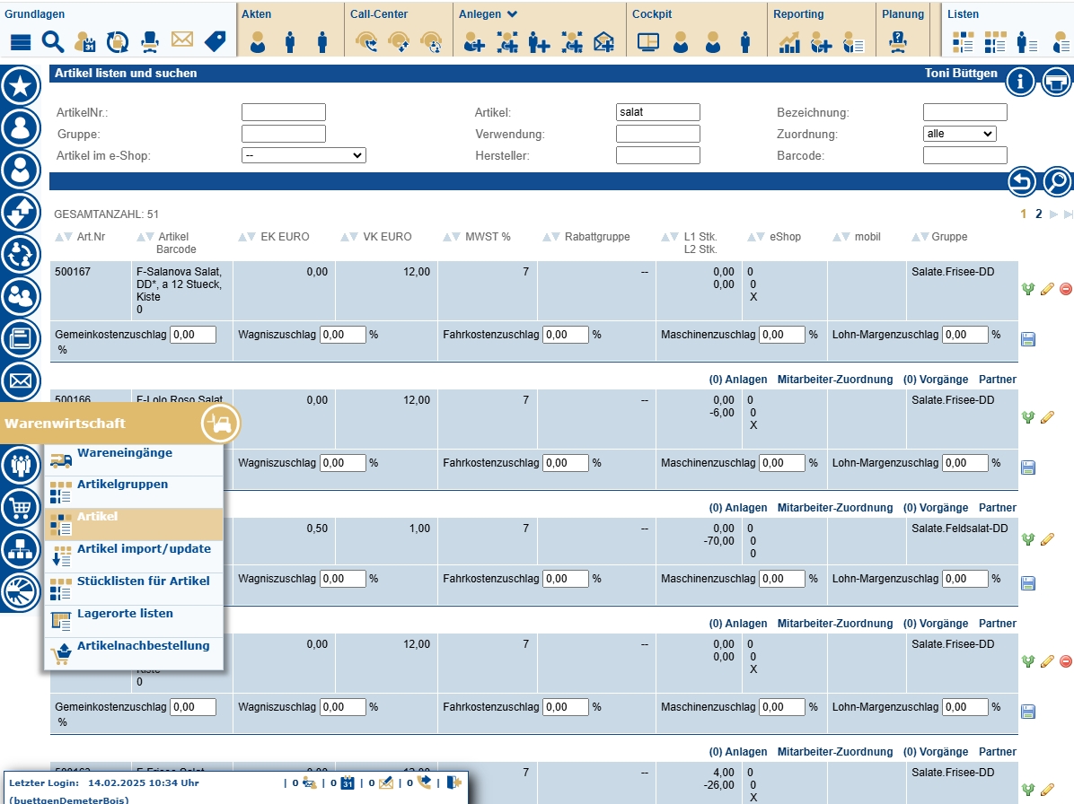 Lager & Logistik: Artikel- und Barcode-Suche, Bestandsübersichten (Haupt- und KFZ-Lager), Zuschlagskalkulation, direkte Bestandsbuchungen über Belege und LAGER APP.